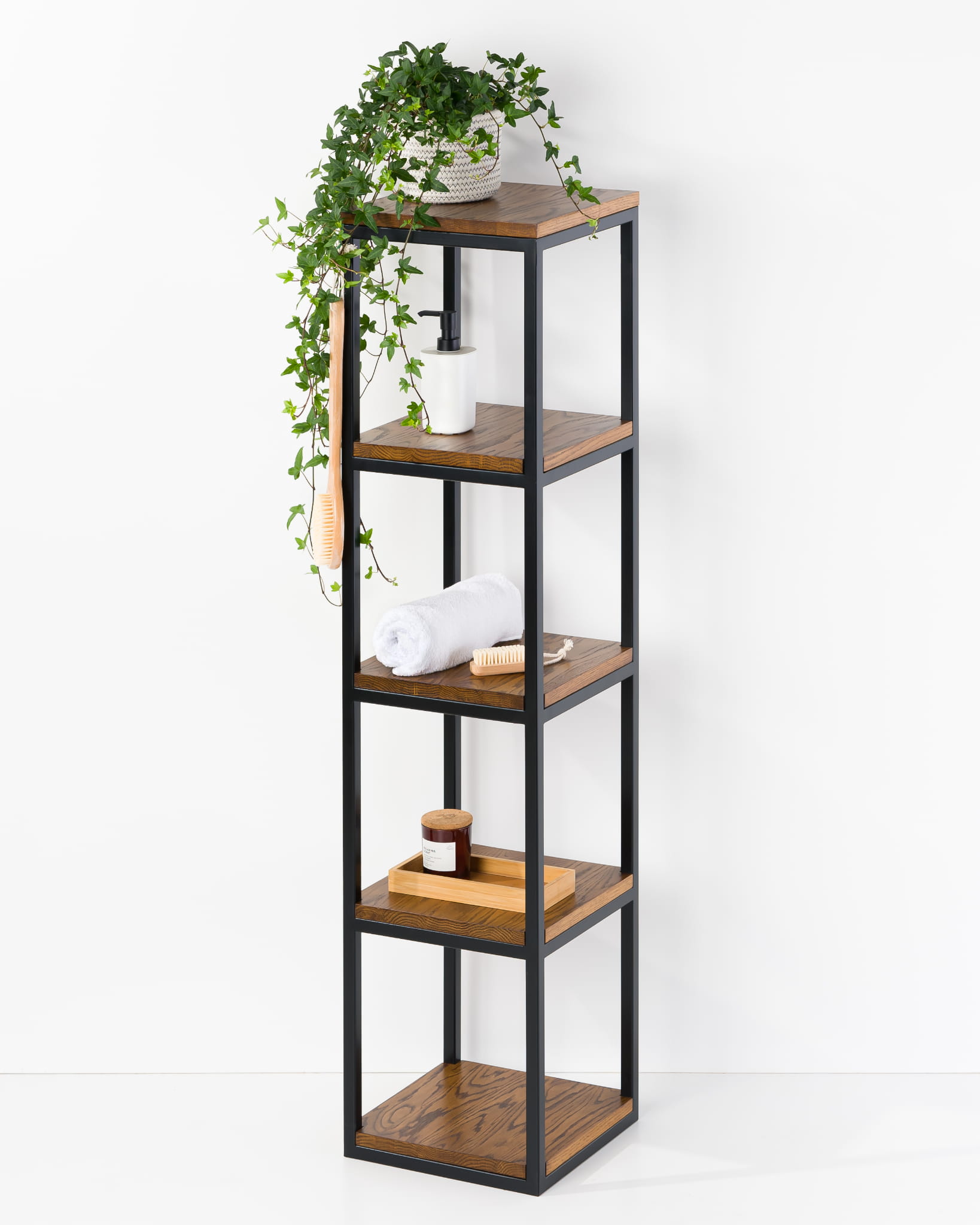 Jeśli marzy Ci się łazienka w stylu loftowym, dobrze trafiłeś! W naszej ofercie znajdziesz produkty, które idealnie wpasują się w nowoczesną stylistykę. Po raz kolejny łączymy drewno z metalem, a więc stawiamy na ponadczasowy efekt, dzięki czemu TEO posłuży Ci przez wiele lat. TEO to pojemny słupek łazienkowy, który pomieści wszystkie Twoje kosmetyki i akcesoria. Możesz na nim również poukładać ręczniki lub ustawić kwiaty, które staną się piękną ozdobą Twojej łazienki. Miejsca jest sporo, wybierz sam i baw się aranżacjami. TEO zdecydowanie podkreśli charakter wnętrza. Może stać bezpośrednio na podłodze lub przystosujemy go do powieszenia na ścianie, dzięki czemu szafka będzie wyglądać wyjątkowo lekko. Dopasuj TEO do szafki łazienkowej i wybierz półeczkę prysznicową. U nas możesz stworzyć ciekawy komplet! Produkt został pomalowany proszkowo, oferujemy dwa wybarwienia do wyboru: biały i czarny.