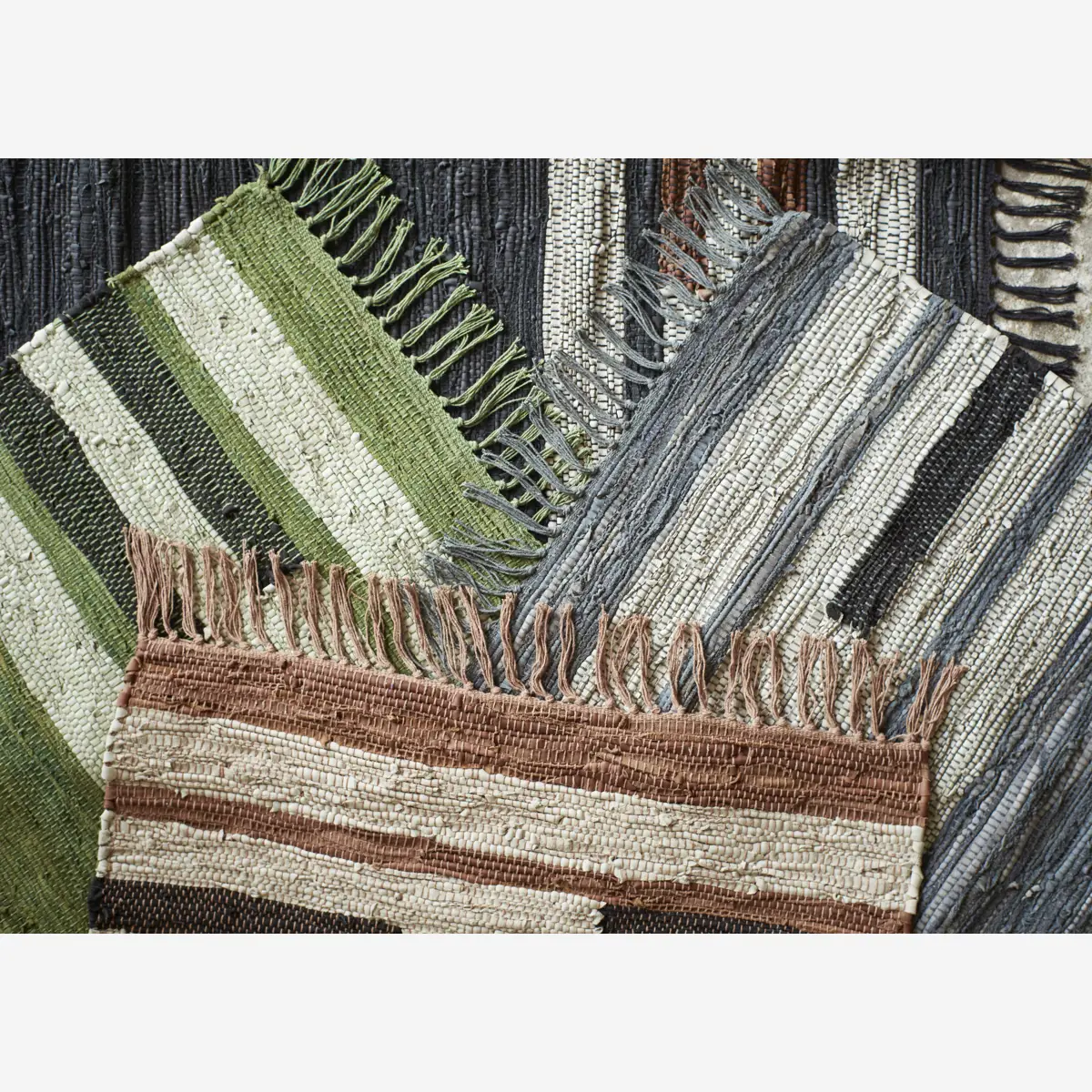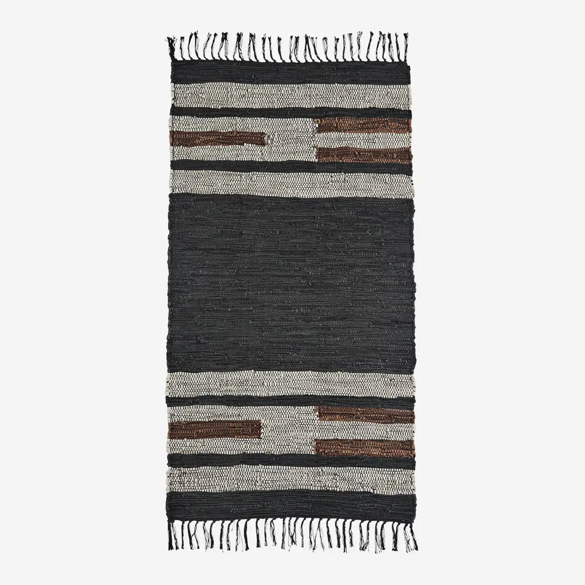 Ręcznie tkany dywan z pasków skóry (90%) i bawełny (10%) to wyjątkowy dodatek do każdego wnętrza. W naturalnych odcieniach czerni, jasnoszarości i brązu, dywan ten dodaje ciepła i stylu przestrzeni. Zaleca się stosowanie podkładu, aby zapobiec przesuwaniu oraz czyszczenie odkurzaczem.