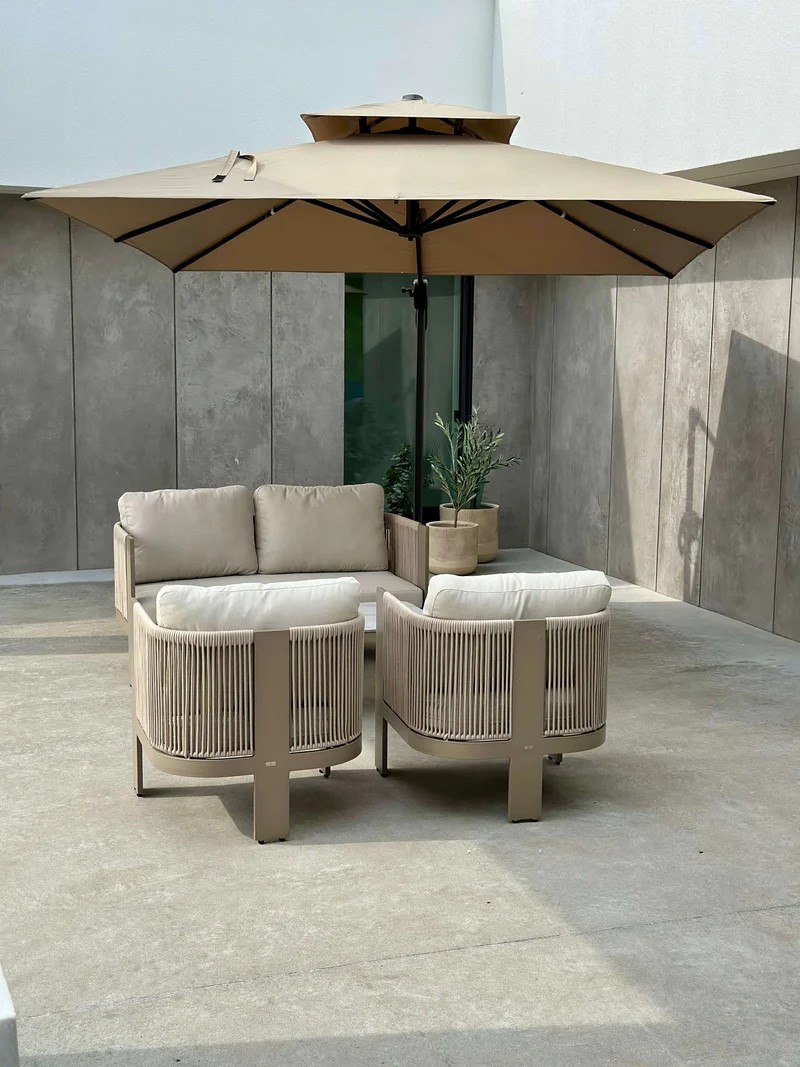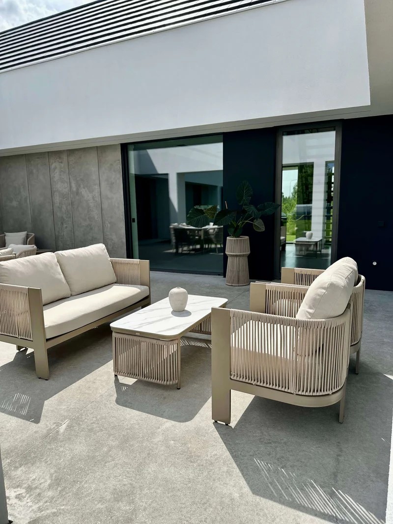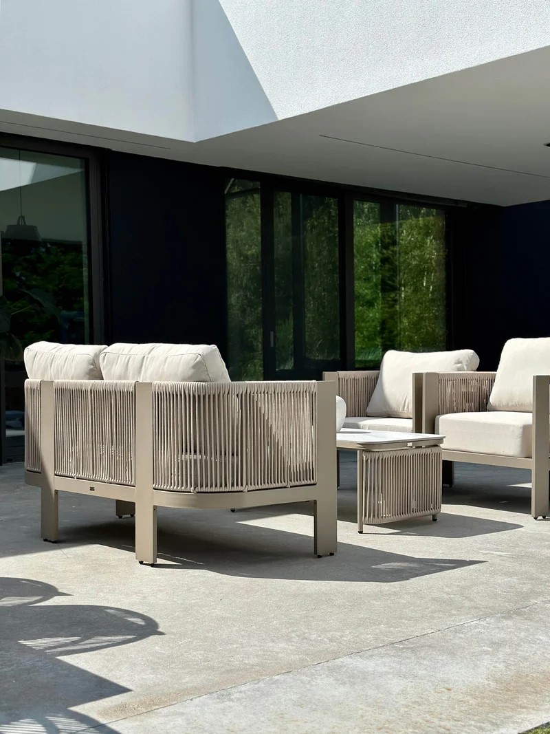 Szkielet sofy wykonany został z wysokogatunkowego aluminium, co czyni ją odporną na korozję, lekką i łatwą do przenoszenia. Trwałość i stabilność materiału sprawiają, że sofa sprawdza się równie dobrze we wnętrzach, jak i na zewnątrz – niezależnie od warunków atmosferycznych.