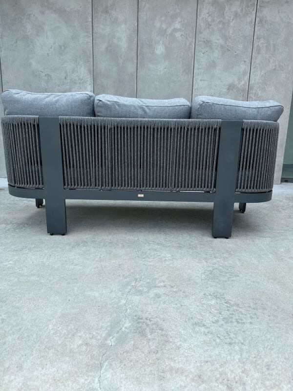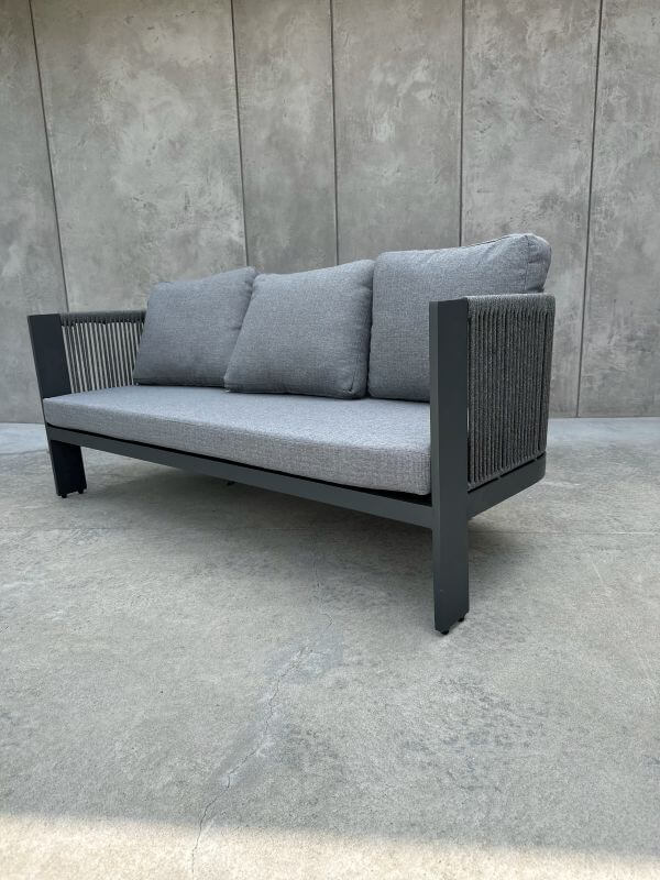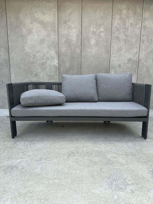 Konstrukcja sofy została wykonana z trwałego aluminium, które jest lekkie, odporne na korozję i łatwe do przenoszenia. Dzięki temu mebel doskonale sprawdzi się zarówno we wnętrzach, jak i na zewnątrz, oferując długotrwałą wytrzymałość i nowoczesny wygląd.