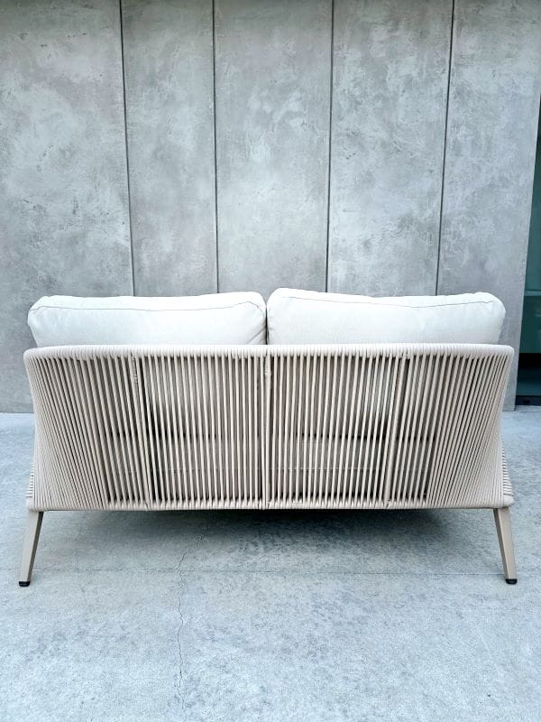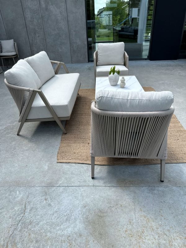 Szkielet sofy wykonany został z wytrzymałego aluminium malowanego proszkowo, które zapewnia lekkość konstrukcji oraz odporność na zmienne warunki atmosferyczne. To materiał, który doskonale sprawdza się na zewnątrz – nie koroduje, nie odkształca się i zachowuje swój wygląd przez lata.