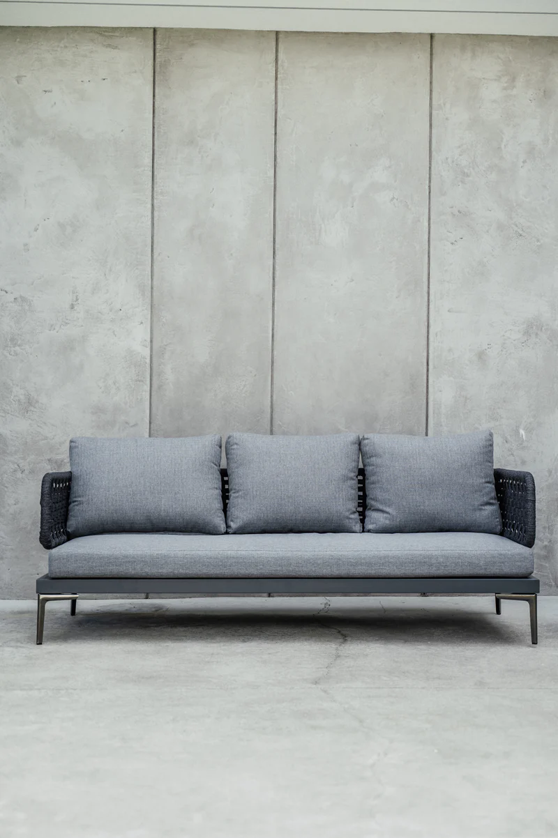 Trzyosobowa sofa Tiziano łączy w sobie lekki, nowoczesny design z wyjątkowym komfortem — idealny wybór do strefy wypoczynkowej na tarasie, w ogrodzie lub dużym balkonie.
