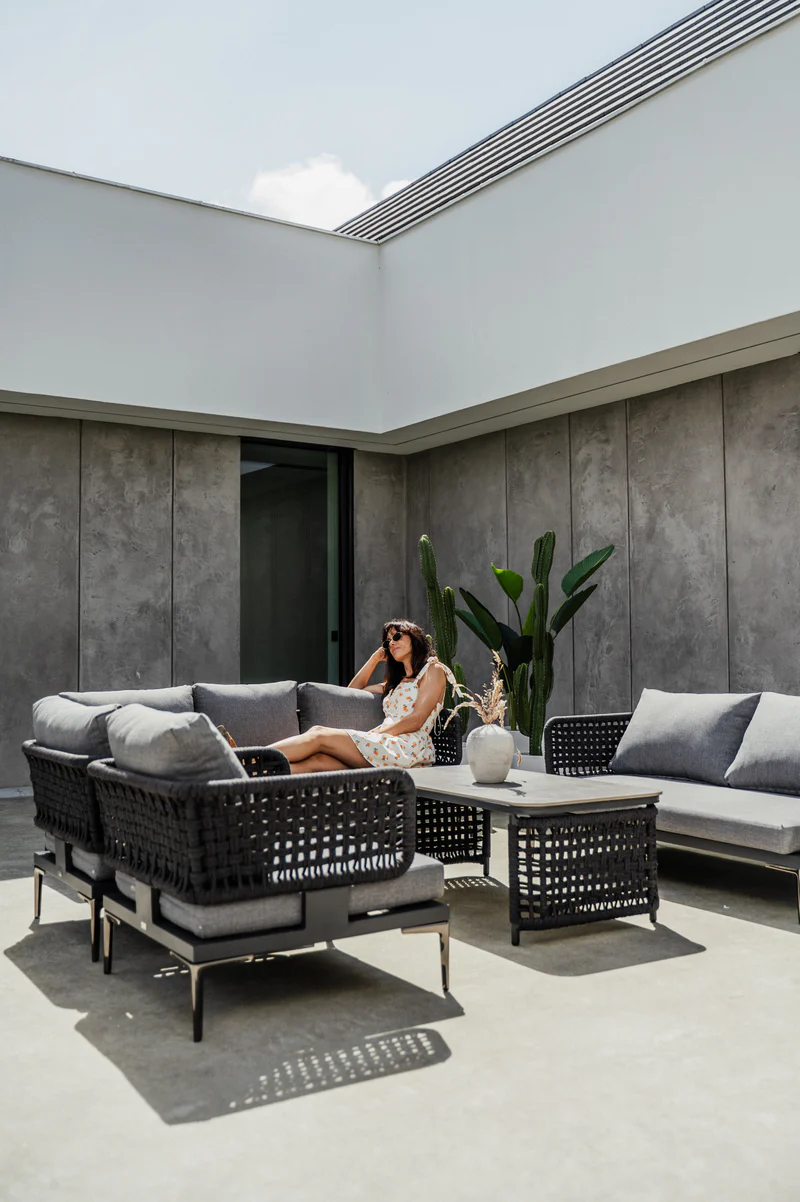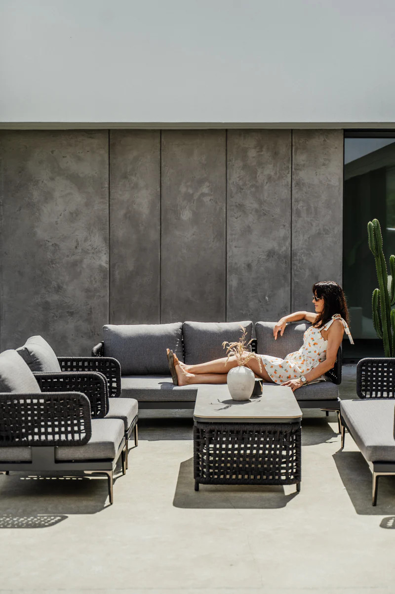 Boki sofy: dekoracyjna plecionka ze sznurka wodoodpornego, która zachowuje kolor i formę nawet przy intensywnym użytkowaniu.