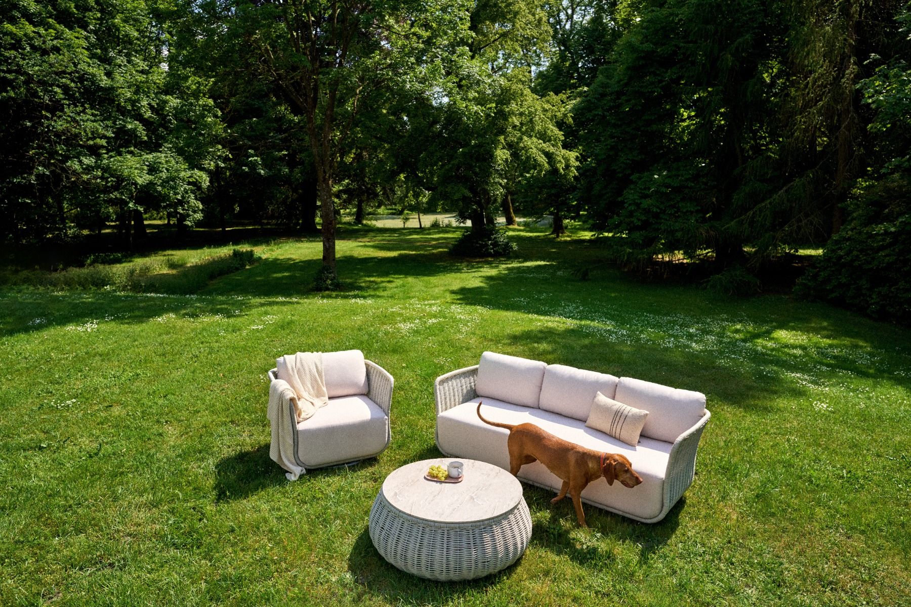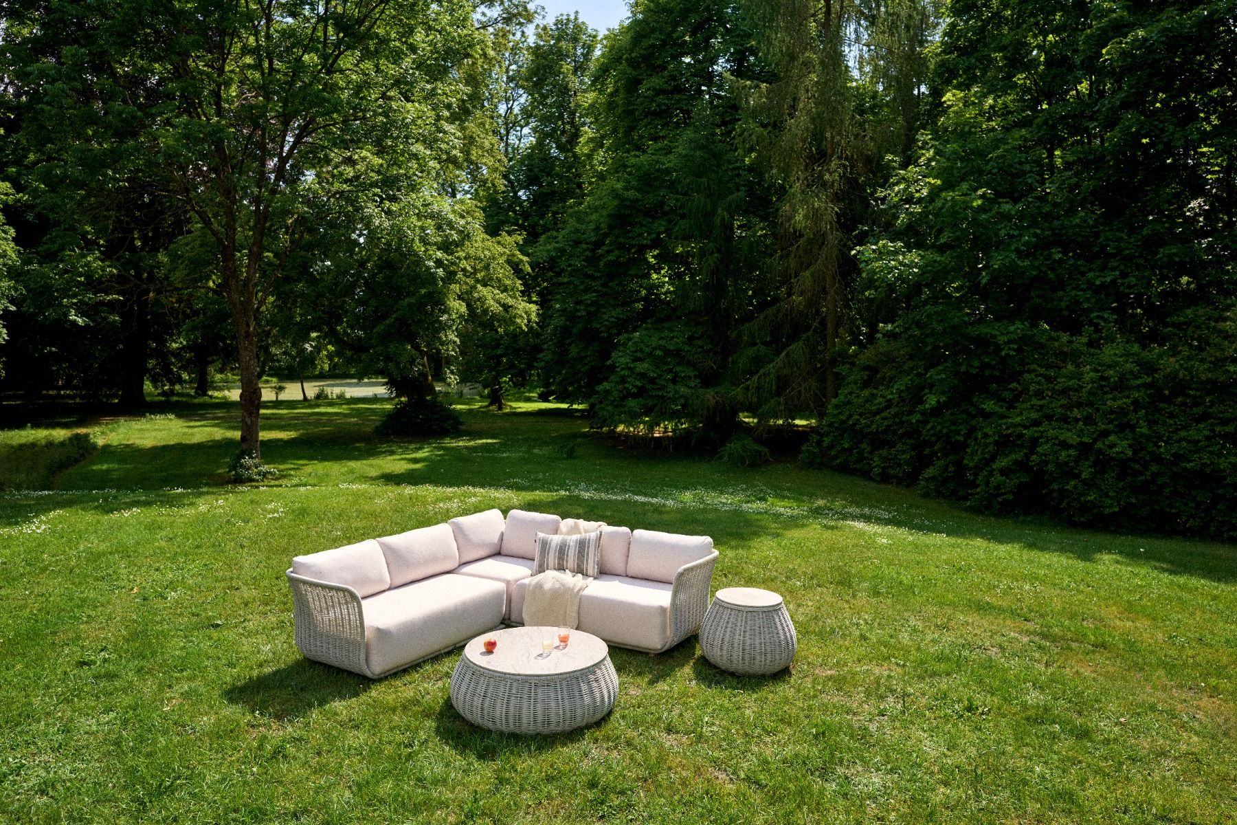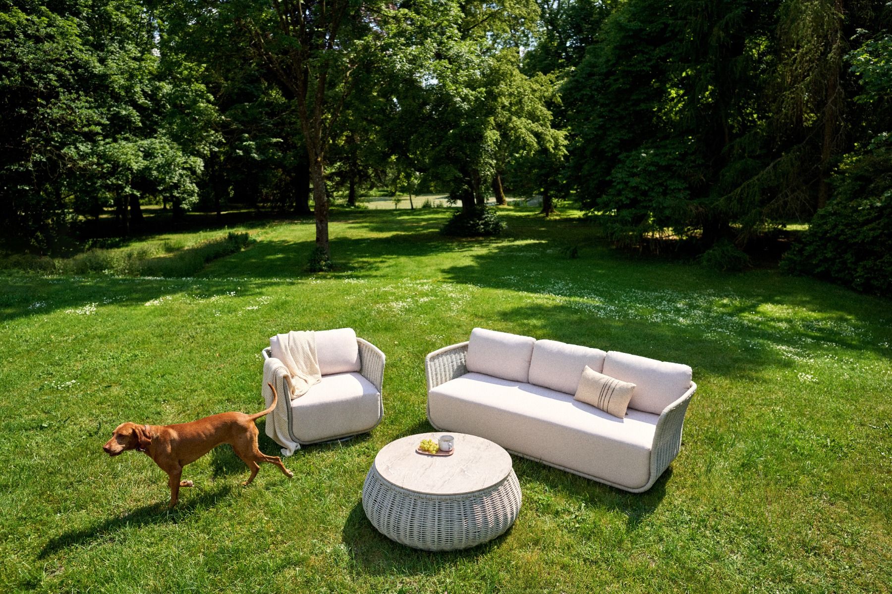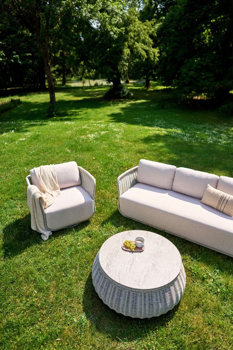 Sofa Pioverna to mebel, który przenosi klimat elitarnych nadmorskich kurortów wprost na Twój taras. Jej charakterystyczny stelaż wykończony szarym sznurkiem nadaje bryle lekkości i unikatowego, rzemieślniczego wyrazu. To idealna propozycja dla trzech osób, łącząca w sobie nowoczesną ergonomię z kojącą, jasną estetyką, która fenomenalnie kontrastuje z ogrodową zielenią.