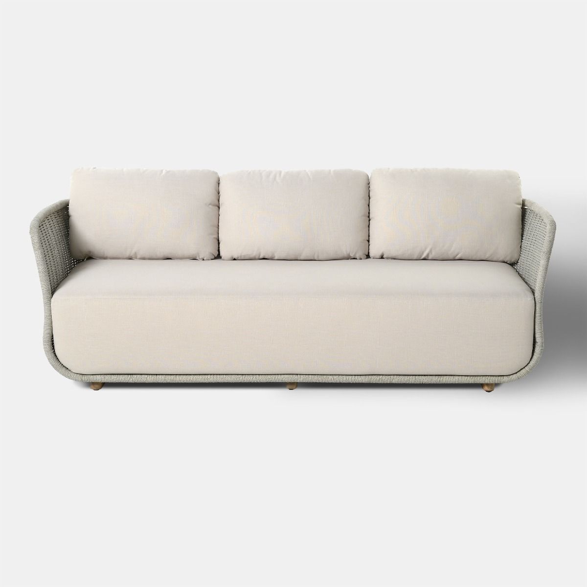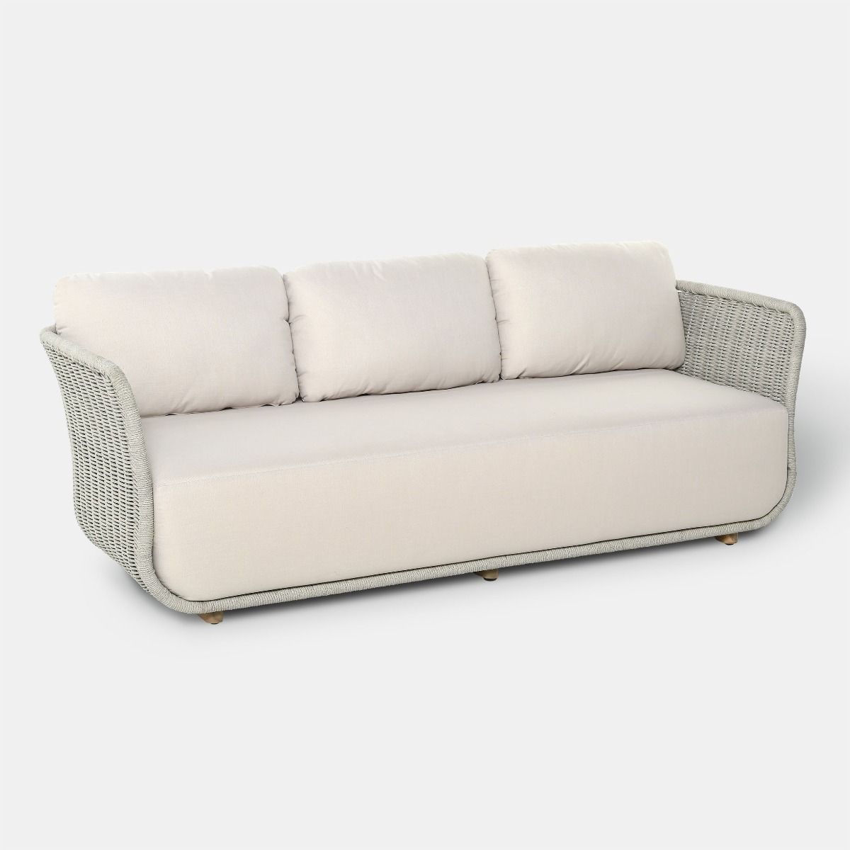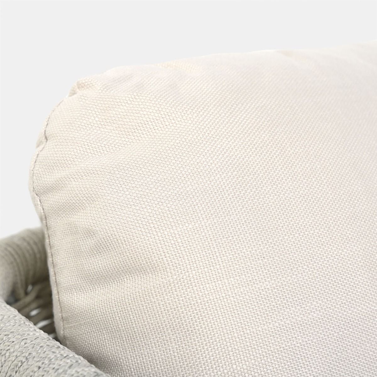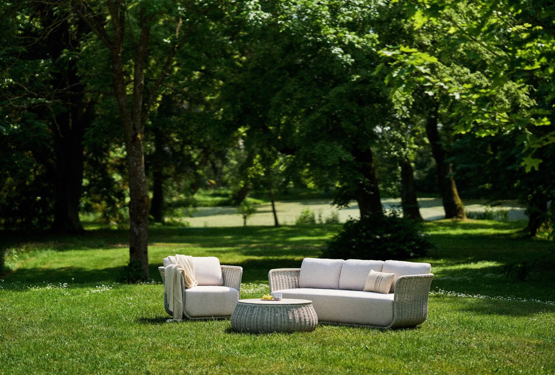 Sofa Pioverna to mebel, który przenosi klimat elitarnych nadmorskich kurortów wprost na Twój taras. Jej charakterystyczny stelaż wykończony szarym sznurkiem nadaje bryle lekkości i unikatowego, rzemieślniczego wyrazu. To idealna propozycja dla trzech osób, łącząca w sobie nowoczesną ergonomię z kojącą, jasną estetyką, która fenomenalnie kontrastuje z ogrodową zielenią.