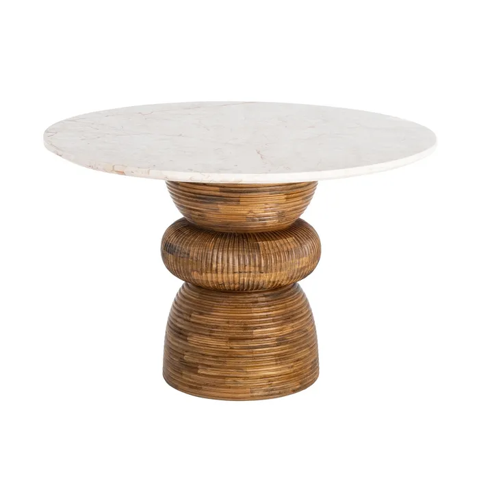 Stół jadalniany z kolekcji Room to projekt dla koneserów, którzy szukają mebli o silnej osobowości. Połączenie ciężkiego, naturalnego marmuru z egzotycznym drewnem mango tworzy kompozycję pełną dostojeństwa i surowej elegancji. To mebel, który nie tylko służy do wspólnych posiłków, ale staje się rzeźbiarskim fundamentem jadalni, obok którego nie da się przejść obojętnie.
