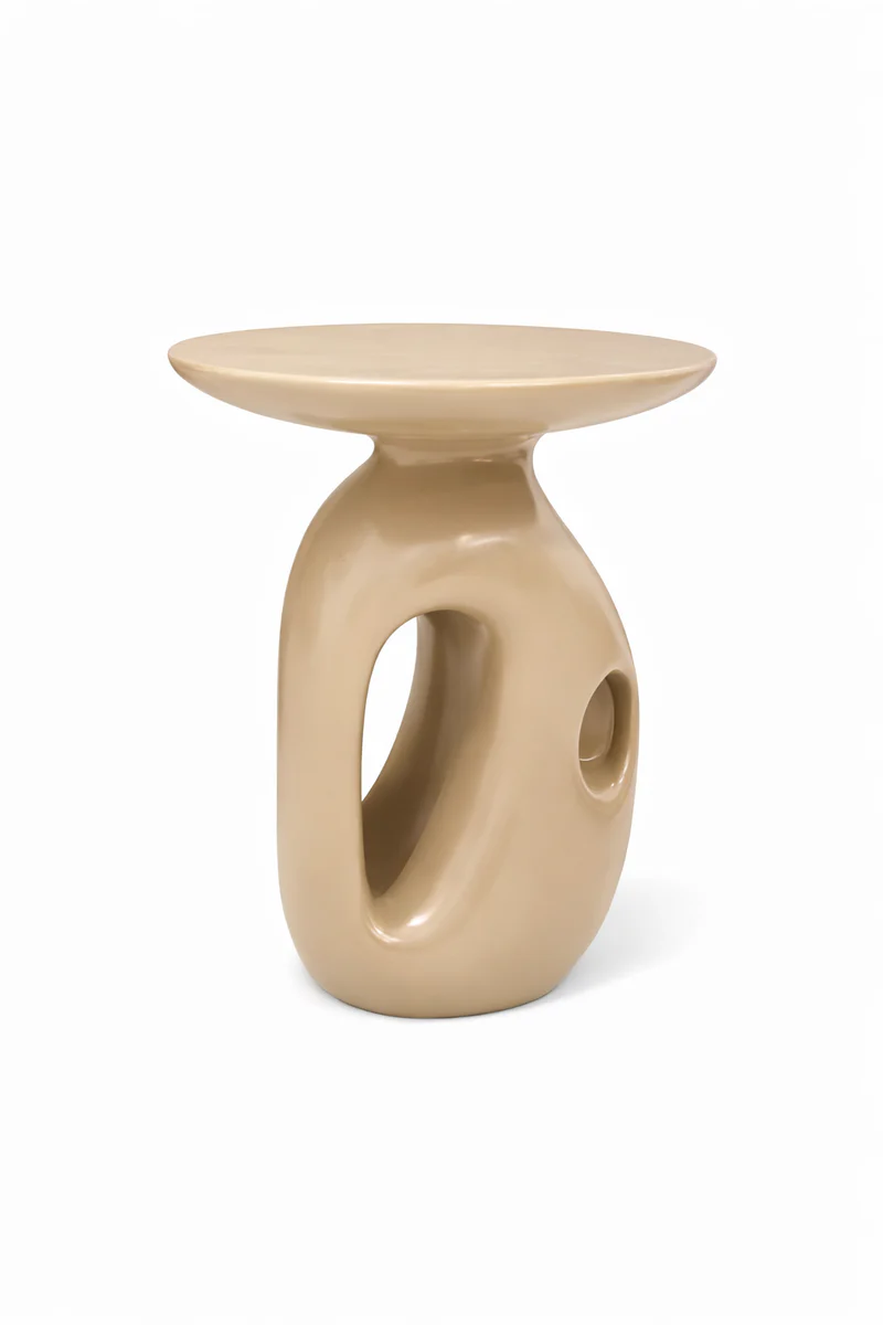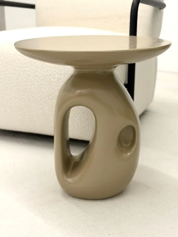 Artystyczna forma: Charakterystyczne, nieregularne otwory i obłe linie sprawiają, że stolik prezentuje się lekko i intrygująco z każdej strony. To design inspirowany naturą i nowoczesną rzeźbą.