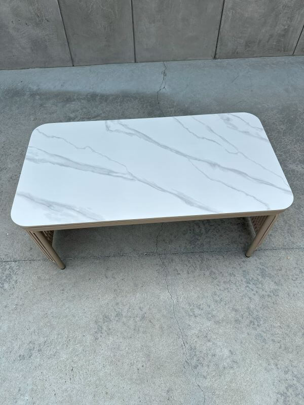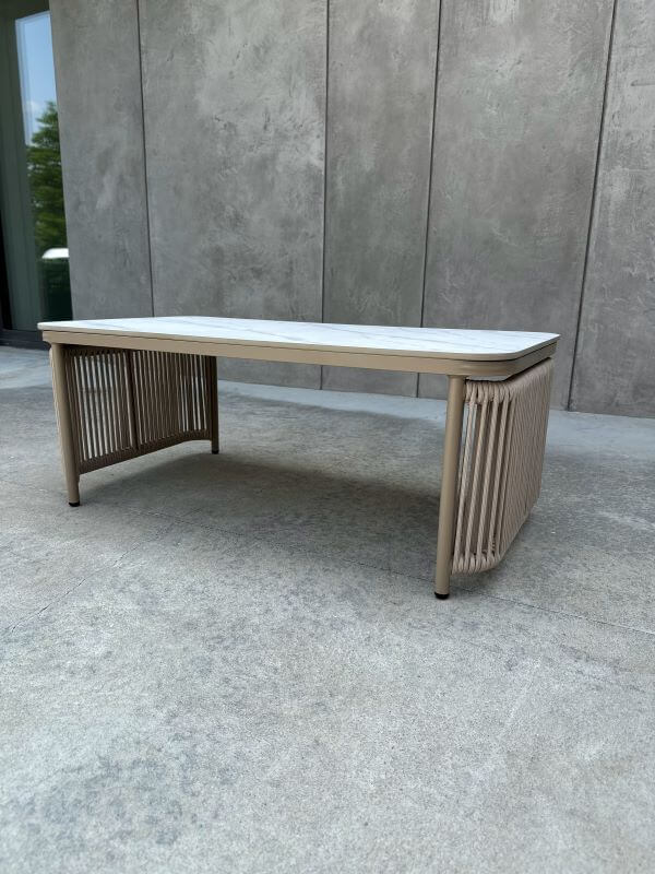 Ceramiczny blat nie tylko dodaje całości elegancji, ale również zapewnia wyjątkową trwałość – odporny na zarysowania, wysoką temperaturę i łatwy do utrzymania w czystości, sprawdza się idealnie w codziennym użytkowaniu. Uroku dodaje mu ręcznie wykonane wykończenie w dolnej partii – delikatna, pleciona struktura wprowadza lekkość i rzemieślniczy sznyt, który ożywia prostą formę stolika.