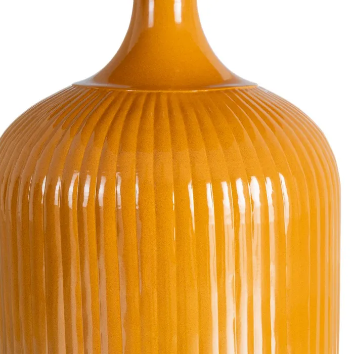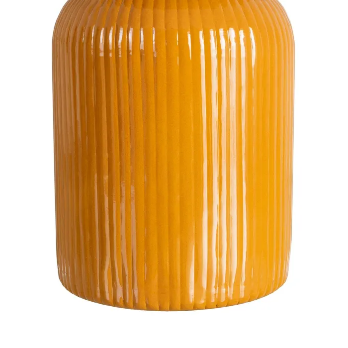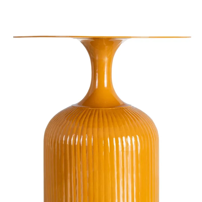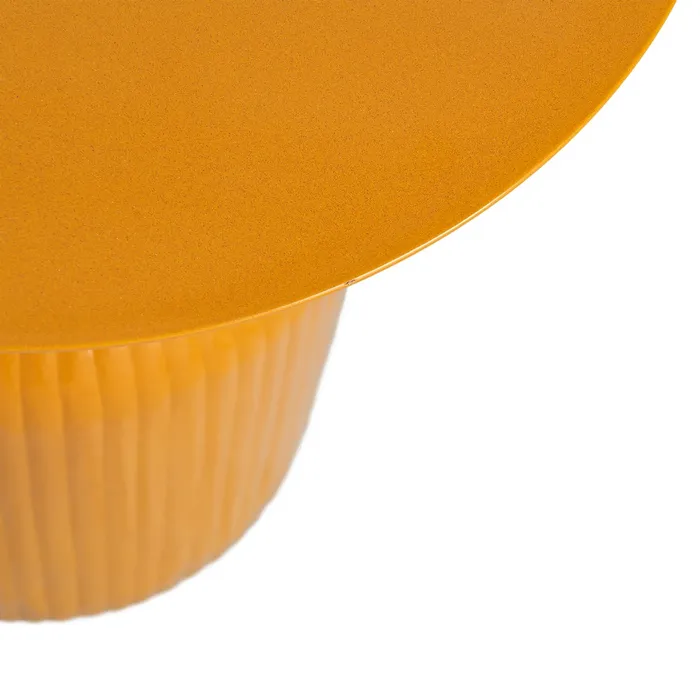 Ten metalowy stolik to projekt, który stawia na wyrazisty detal. Konstrukcja charakteryzuje się masywną, cylindryczną podstawą ozdobioną pionowymi prążkami, która płynnie zwęża się ku górze, tworząc smukłą szyjkę zwieńczoną gładkim, okrągłym blatem. Lśniące wykończenie w kolorze musztardowym podkreśla rytmiczną strukturę podstawy, tworząc efektowną grę światła i cienia, która nadaje meblowi wizualnej głębi.