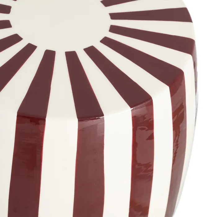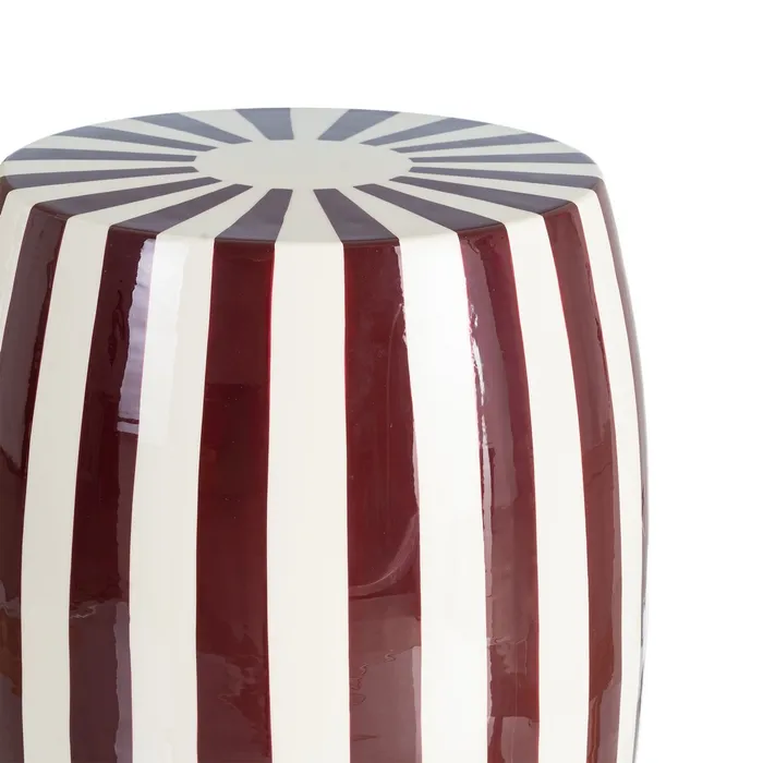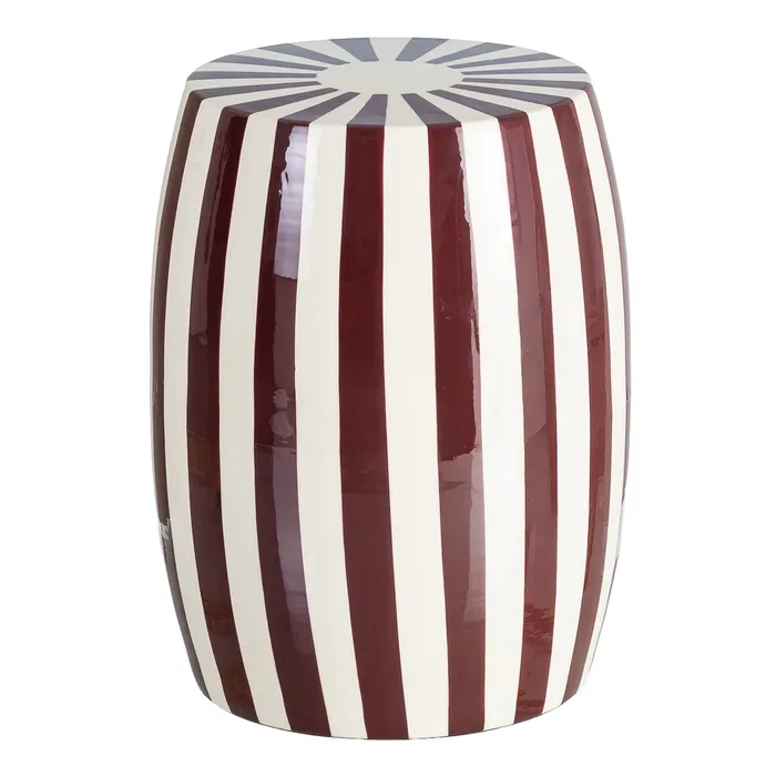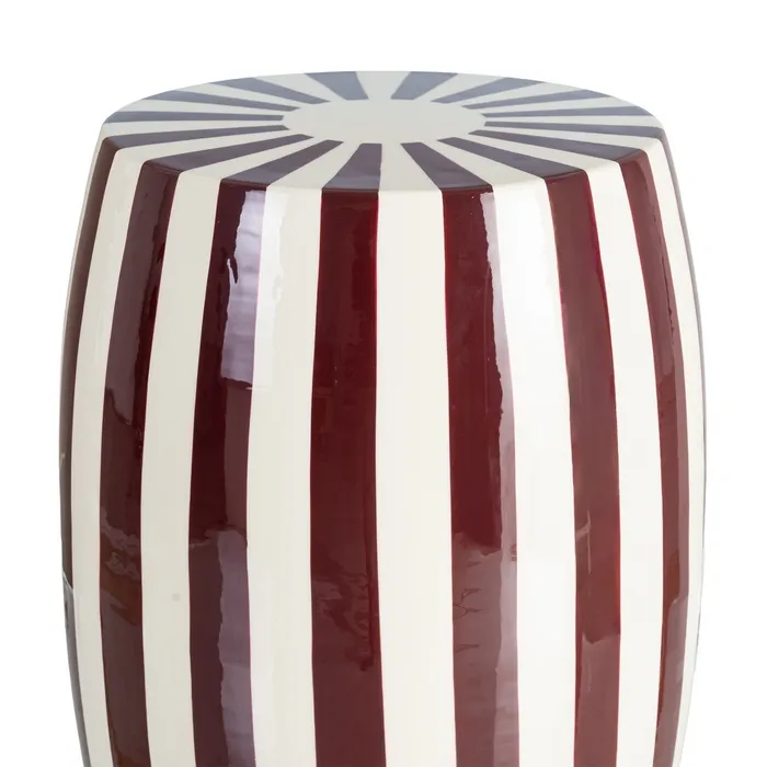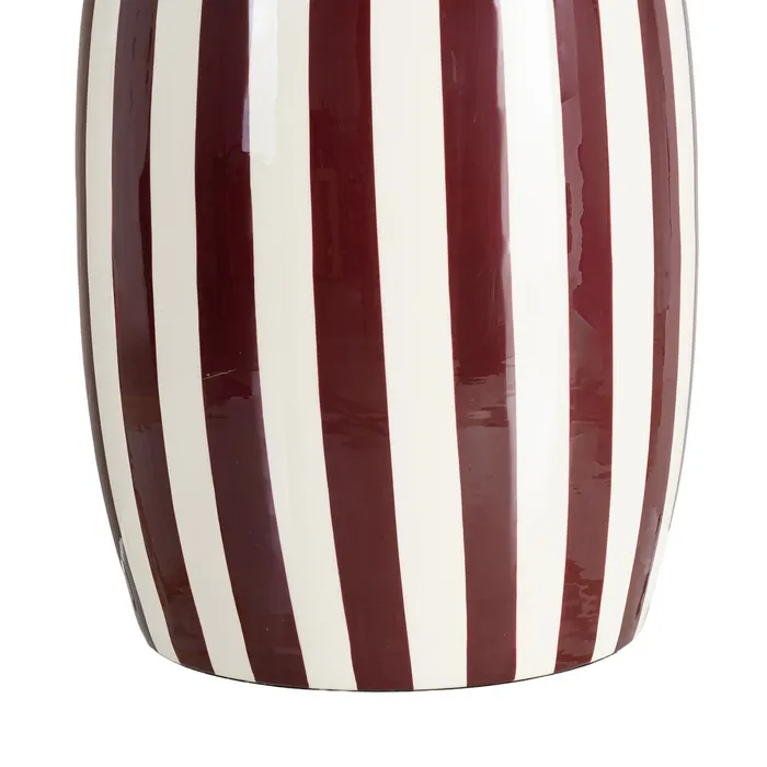 Stolik boczny paski - bordowy to wyrazisty element dekoracyjny, który przyciąga wzrok swoją unikatową formą beczki i dynamicznym motywem pasów. Połączenie głębokiego bordowego z kremową bielą tworzy stylowy kontrast, nadając wnętrzu wyrafinowanego charakteru z nutą nowoczesnego pop-artu.