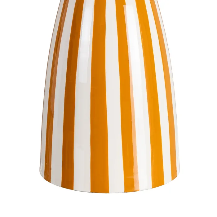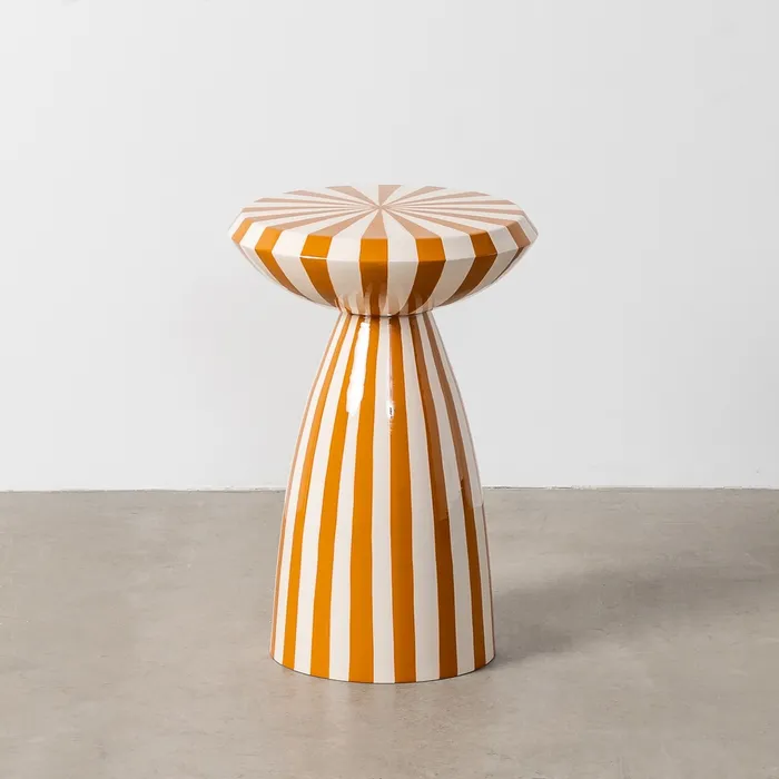 Stolik boczny paski - musztarda to esencja radosnego designu, która wprowadzi do Twojego wnętrza energię i nowoczesny sznyt. Wyrazisty wzór promienistych pasów w kolorze głębokiej musztardy, połączony z unikalną, kielichowatą sylwetką, tworzy mebel obok którego nie da się przejść obojętnie.