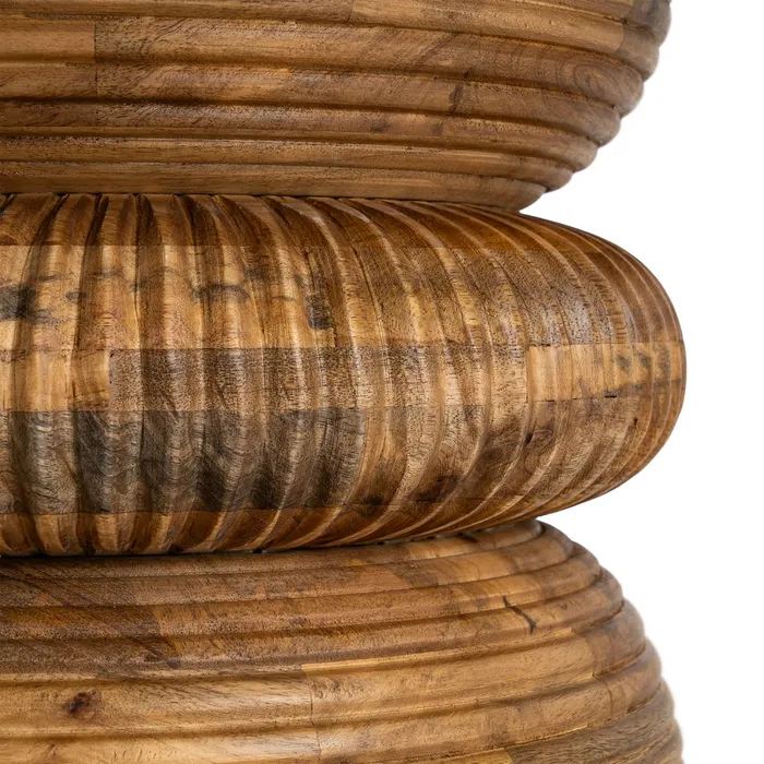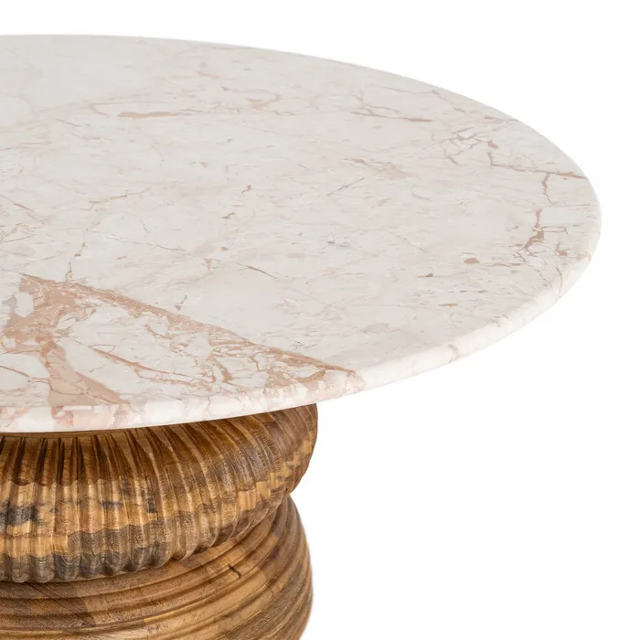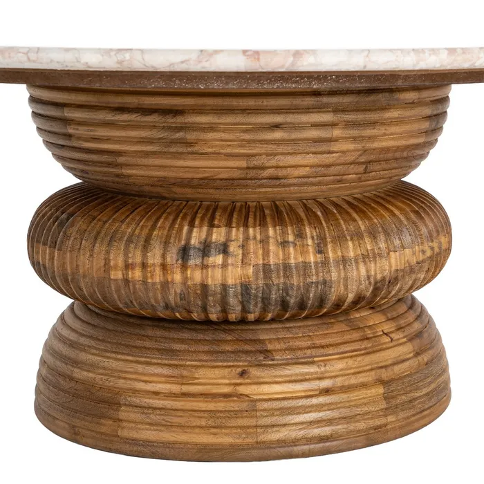 Podstawa z drewna mango: Egzotyczne drewno mango charakteryzuje się wyjątkową twardością i pięknym, złotawym usłojeniem. Stanowi solidny fundament, który idealnie balansuje elegancję marmurowego blatu.
