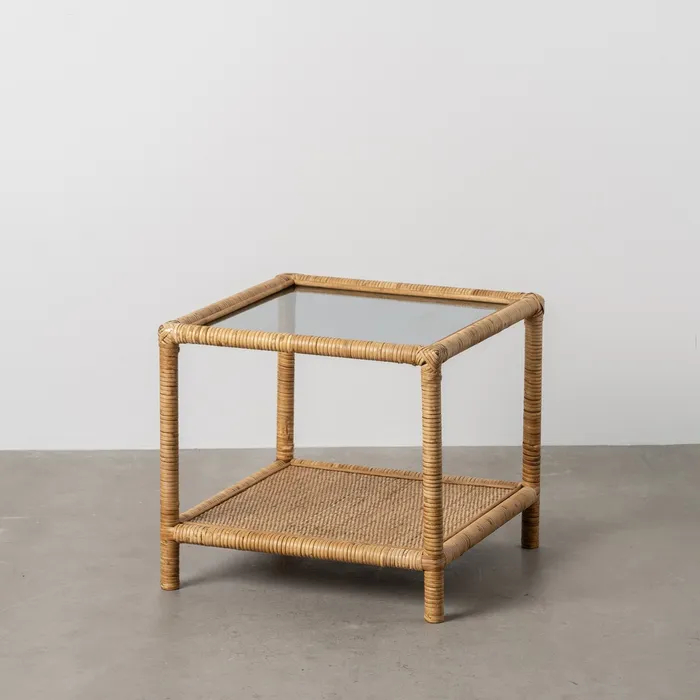 Kwadratowy stolik wykonany ręcznie z naturalnego rattanu. Stolik posiada szklany blat, dzięki czemu jest łatwy w utrzymaniu czystości.