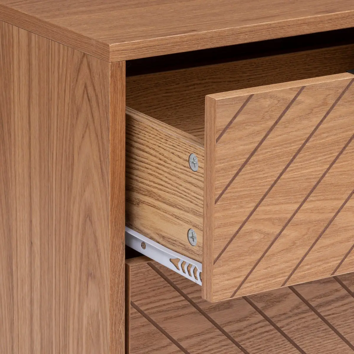 Ten drewniany stolik nocny utrzymuje się na metalowych nogach z drutu. Dwie szuflady ozdobione są jodełkami, które nadają całości nowoczesny wygląd. Ta harmonia materiałów rozjaśni Twoje pomieszczenie.