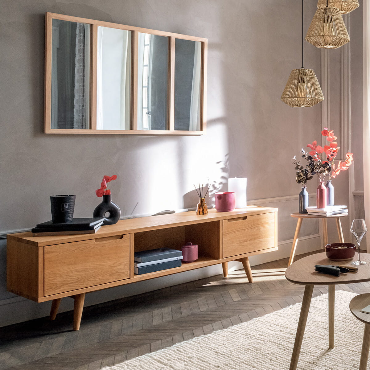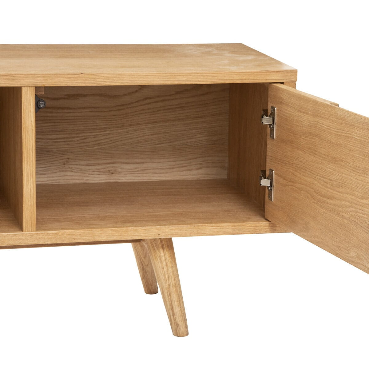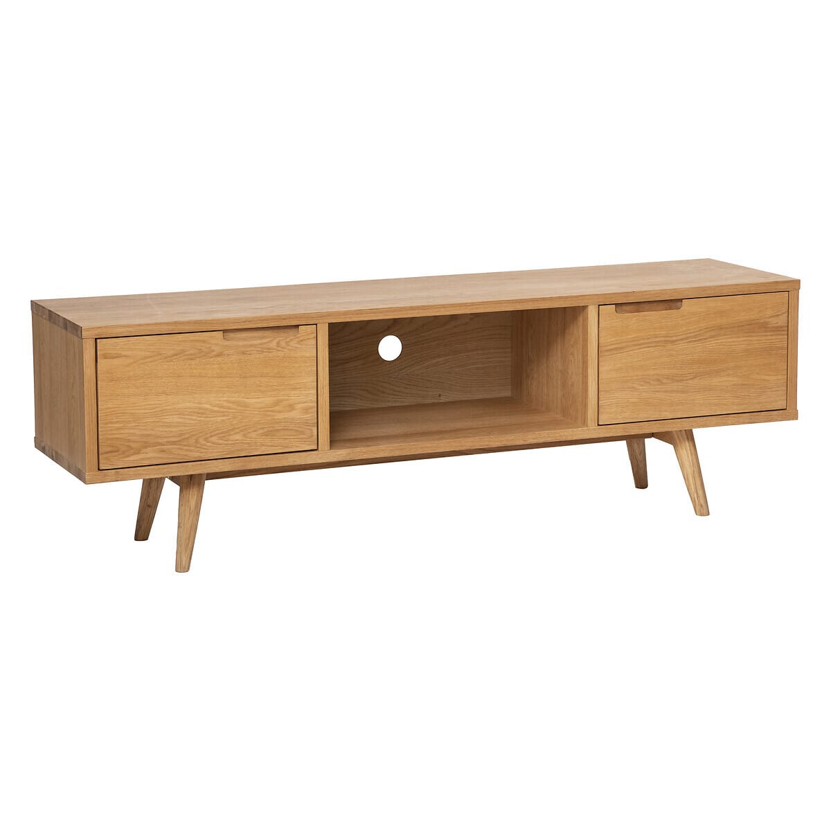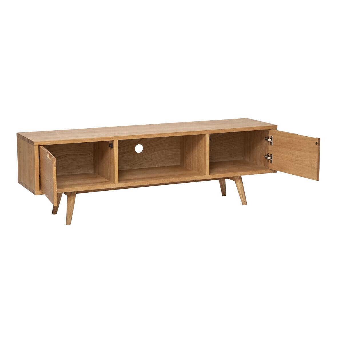 Digha to wytrzymała szafka RTV o naturalnym wyglądzie, wykonana z drewna dębowego, która doskonale wpisuje się w kryteria przytulnego stylu skandynawskiego. Posiada otwartą przegrodę i dwie metalowe szafki. Można w ten sposób przechowywać przedmioty codziennego użytku, pilota, czy umieszczać elementy dekoracyjne.