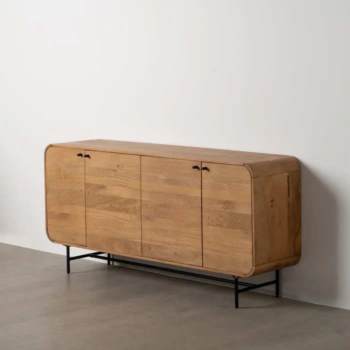 Szafka wykonana z drewna mango to elegancki mebel o naturalnym wyglądzie, który wprowadza ciepło i przytulność do wnętrza. Drewno mango charakteryzuje się bogatym, ciepłym odcieniem z unikalnymi, nieregularnymi słojami, które nadają meblowi indywidualny charakter. Szafka wspiera się na metalowych nogach, które nadają mu nowoczesnego, industrialnego wyrazu, a jednocześnie dodają stabilności i wytrzymałości.