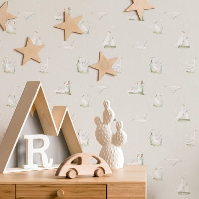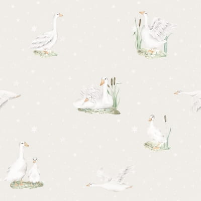 Tapeta winylowa o strukturze płótna z motywem gąsek na jasnobeżowym tle z delikatnymi gwiazdkami.