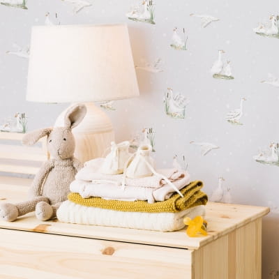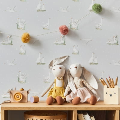 Tapeta winylowa o strukturze płótna z motywem gąsek na jasnobeżowym tle z drobnym wzorem.