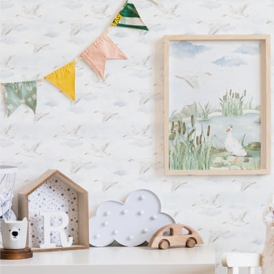 Tapeta winylowa o strukturze płótna z motywem lecących gąsek.