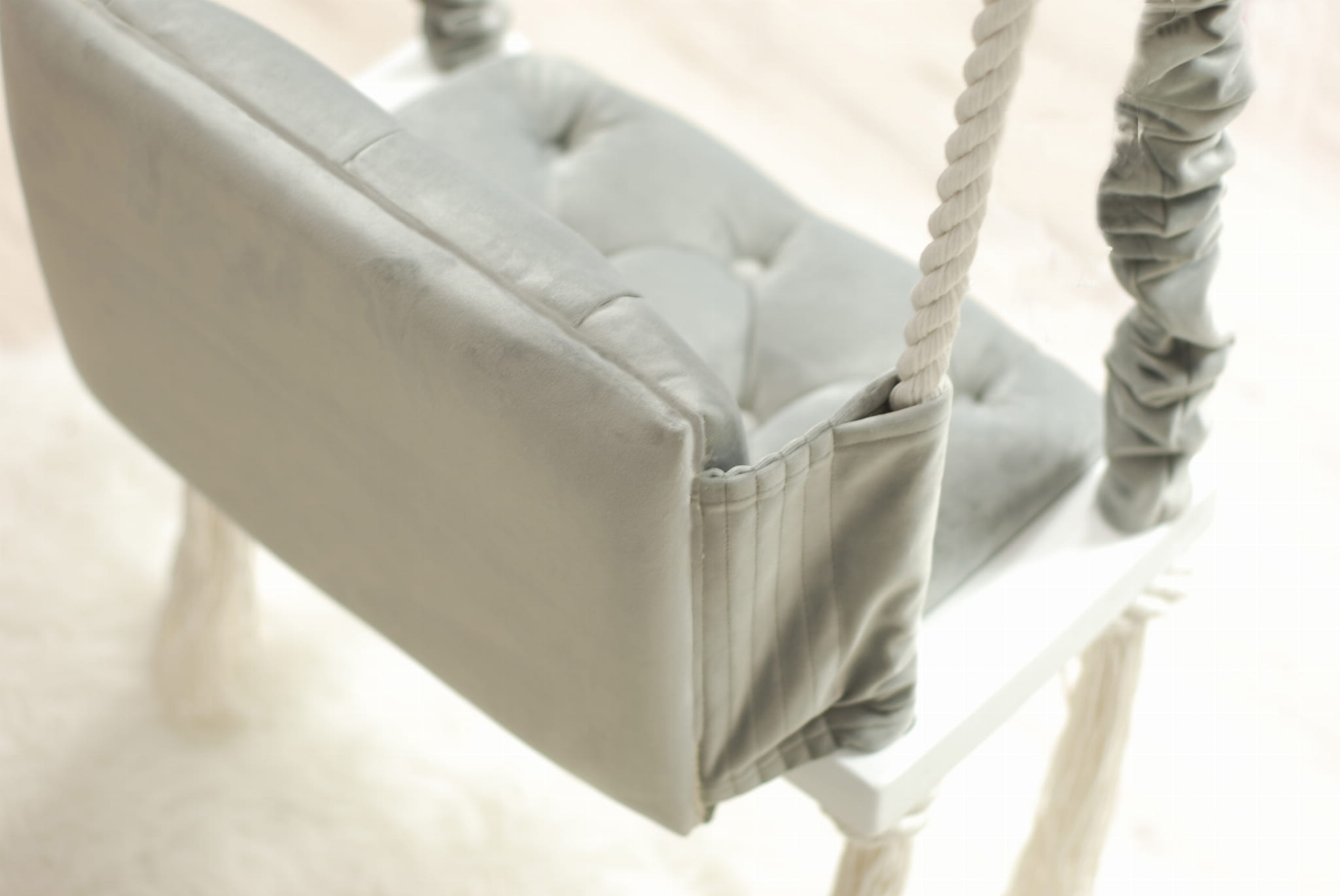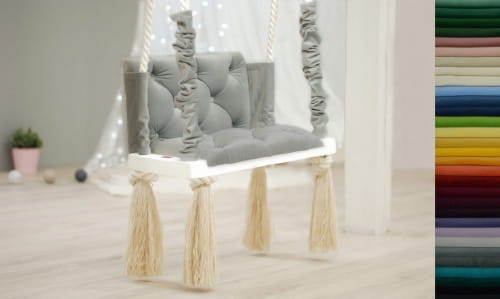 Huśtawka dla dzieci QNIEBU GUZIQ, charakteryzuje się tapicerowanym siedziskiem i oparciem, które są pikowane guzikami. Nadają one eleganckiego i luksusowego wyglądu. Dzięki głębokiemu osadzeniu guzików, nie ma obawy o brak wygody podczas korzystania z huśtawki. Grube, podwójne bawełniane liny, na których wisi huśtawka, częściowo okrywają materiałowe ochraniacze. Eleganckie chwosty pod siedziskiem, nadają niezwykłego uroku i romantyzmu całej huśtawce. To wręcz królewski tron!