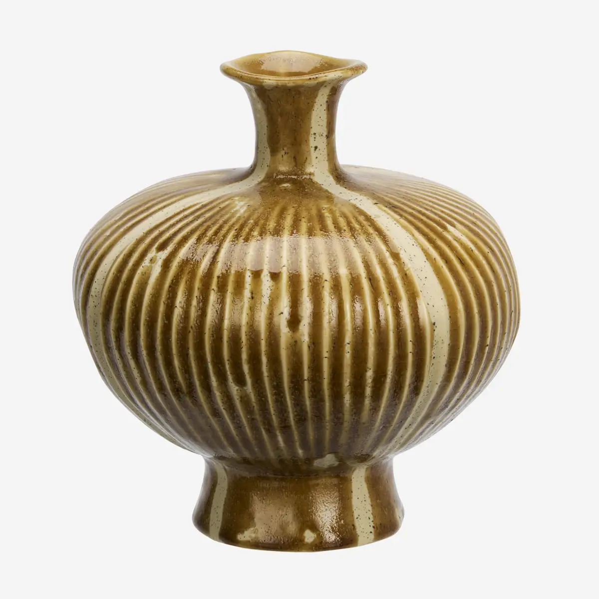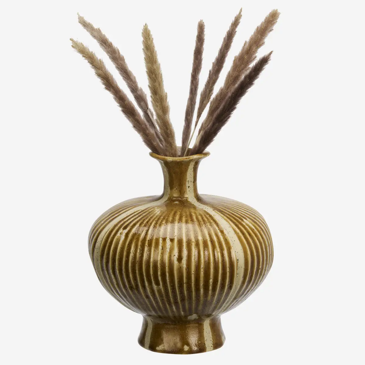Ponadczasowy wazon z kamionki to rzeźbiarski element dekoracyjny, który wnosi do wnętrza spokój i unikalny charakter. Wykonany przez wykwalifikowanych rzemieślników w Chinach, zachwyca swoją formą nawet bez kwiatów – doskonale prezentuje się jako samodzielna ozdoba na regale, konsoli czy stole w jadalni. Jego żebrowana powierzchnia subtelnie nawiązuje do struktur dna morskiego, intrygująco załamując światło i cień na głębokich, ochrowych tonach. Dzięki sylwetce osadzonej na wąskiej podstawie, wazon łączy w sobie solidność z wizualną lekkością, nawiązując do antycznych znalezisk wydobytych z morskich głębin.