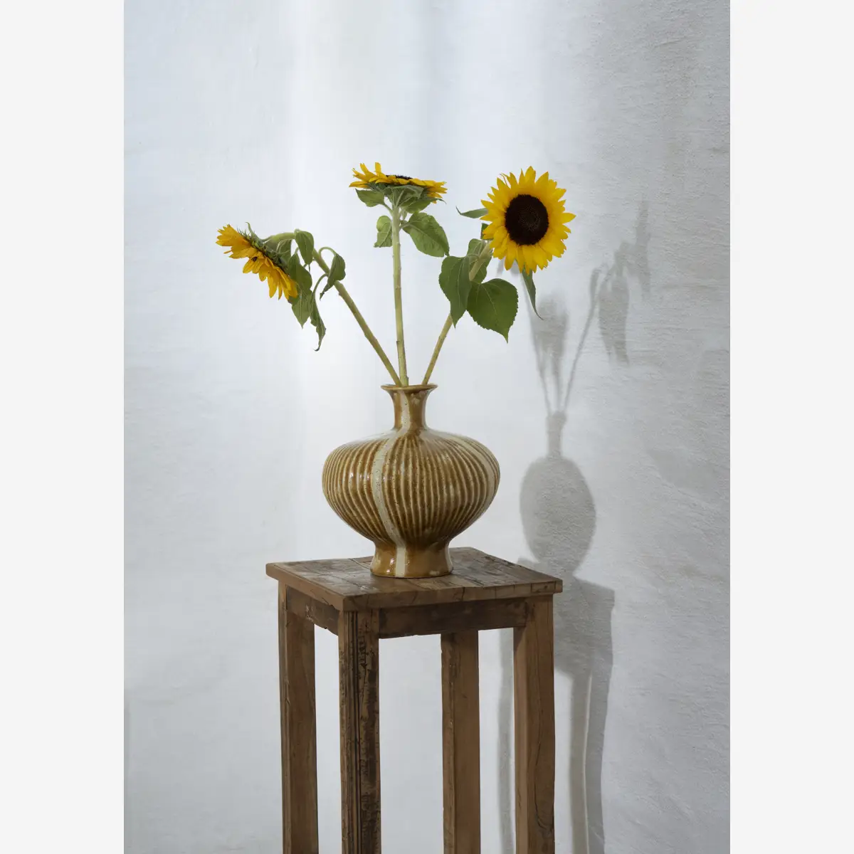 Materiał, z którego został wykonany, to trwała kamionka, wypalana w wysokiej temperaturze dla uzyskania maksymalnej wytrzymałości. Paleta barw oparta na nasyconej musztardzie i naturalnych odcieniach ziemi zyskuje na głębi dzięki procesowi szkliwienia – każde naczynie posiada unikalne nasycenie koloru, drobne nakropienia oraz subtelne różnice w przejściach tonalnych. Te drobne nieregularności podkreślają rzemieślniczy rodowód wazonu i czynią go przedmiotem o niepowtarzalnej duszy.