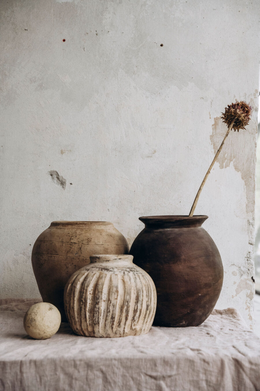 Ta kolekcja dekoracyjnych wazonów to hołd dla kulturowego dziedzictwa Indonezji i lokalnej estetyki. Wazony, ręcznie lepione przez rzemieślników z Bali z drobnoziarnistej gliny, urzekają swoją surową, naturalną strukturą i klasycznymi formami, które subtelnie nawiązują do stylu antique. Barwy ziemi nadają im wyjątkowego charakteru, wprowadzając do wnętrza rustykalny urok.