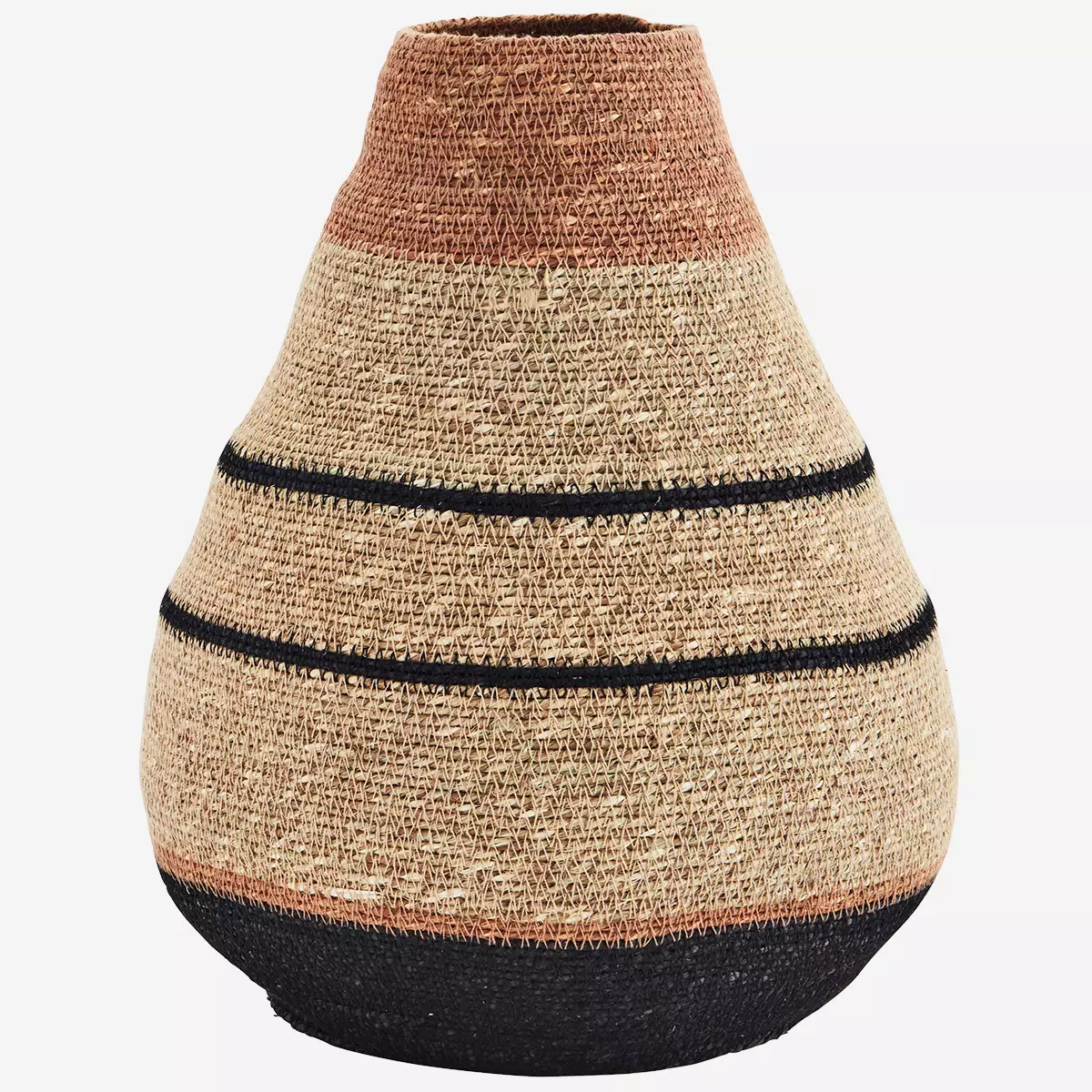 Wazon szyty z trawy morskiej, z renomowanej firmy Madam Stoltz. Charakteryzuje się niepowtarzalnym designem i naturalnym pochodzeniem materiałów. Wykonany ręcznie. Doskonały do sztucznych oraz naturalnych kwiatów.