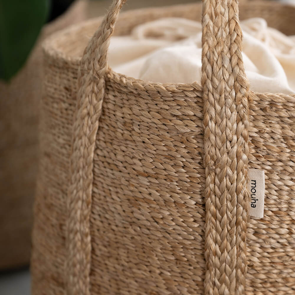 Ręcznie pleciony kosz z naturalnej juty.