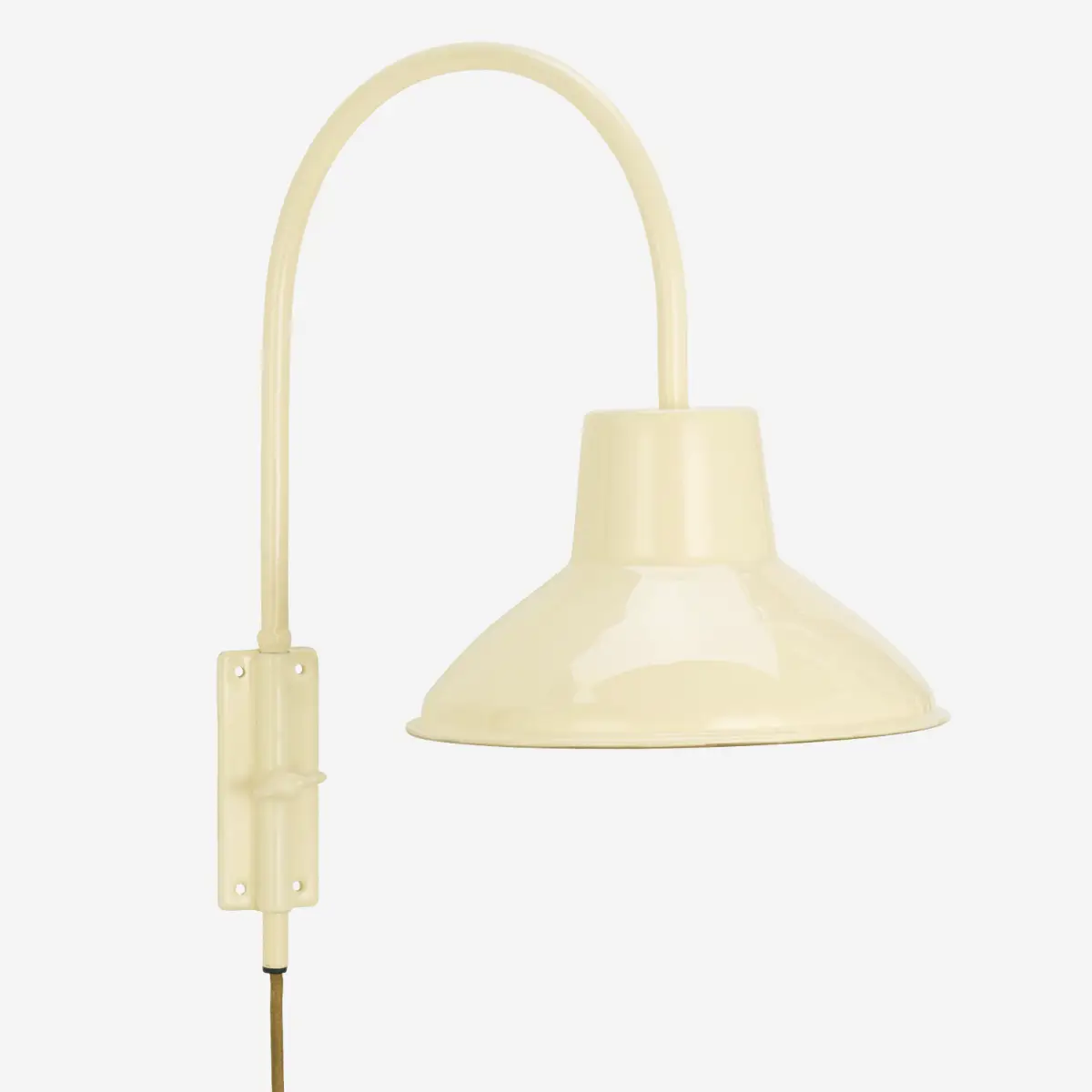 Lampa została wykonana z trwałego żelaza, a jej klosz poddano procesowi ręcznego emaliowania na wysoki połysk. Odcień miękkiej kości słoniowej jest niezwykle subtelny i łatwy do zestawienia z dowolną kolorystyką wnętrza. Każdy egzemplarz posiada drobne, unikalne różnice wynikające z rzemieślniczego procesu produkcji, co nadaje mu indywidualnego charakteru. Kinkiet obsługuje żarówki o mocy do 40W, co pozwala na uzyskanie jasnego, wyraźnego światła idealnego do pracy lub czytania.