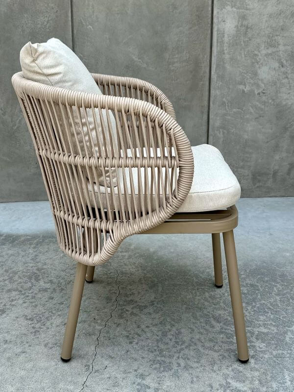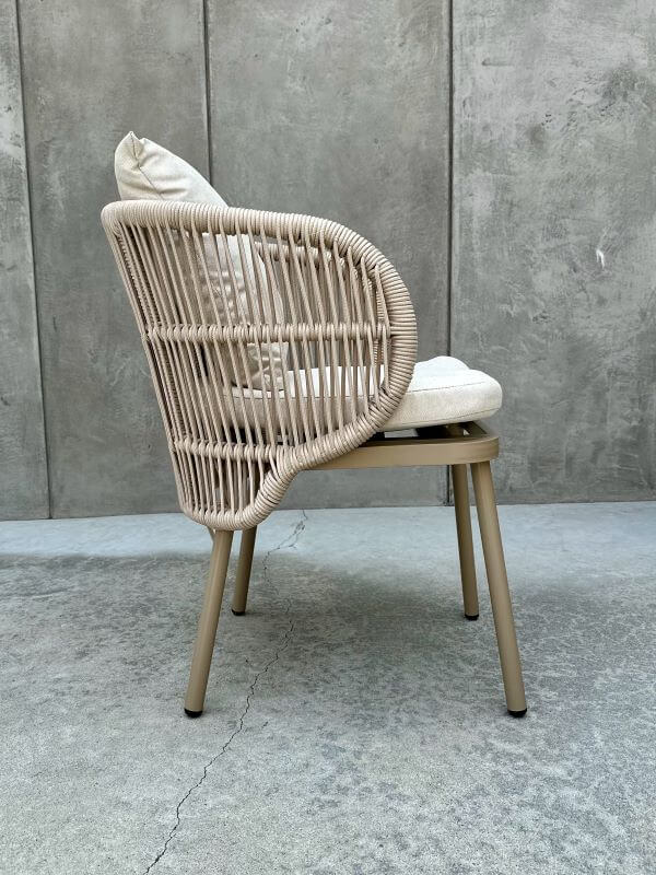 Ergonomia i komfort: Idealnie wyprofilowane oparcie oraz miękkie siedzisko zapewniają wygodę podczas długich letnich kolacji. Przewiewna tkanina poduszek sprawdza się doskonale nawet w upalne dni.