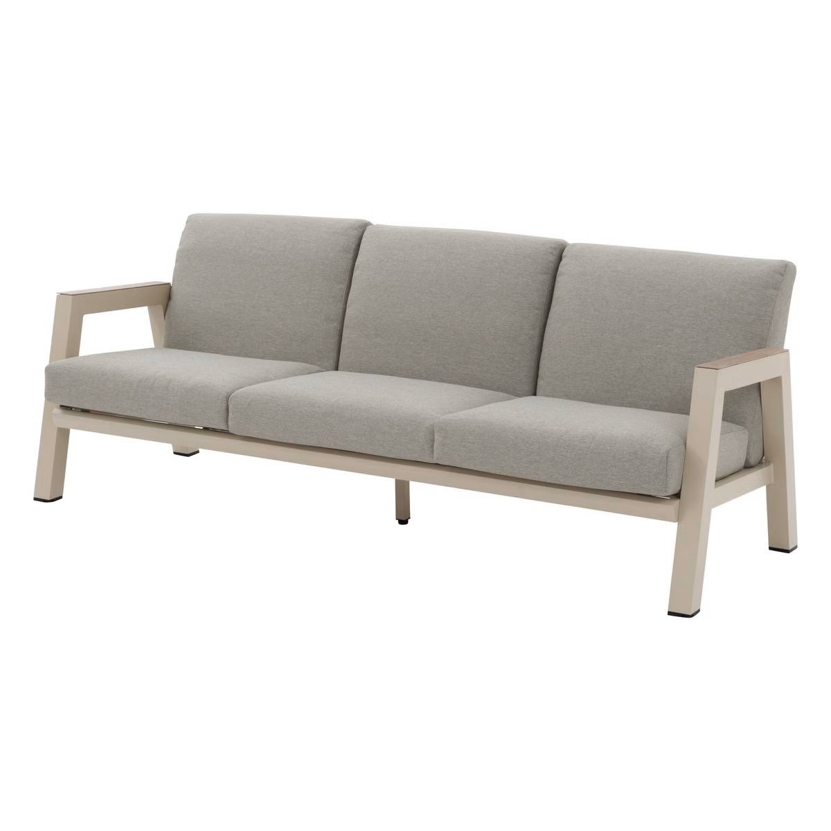 Ten zestaw ogrodowy ma trzyosobową sofę, dwa fotele i prostokątny stolik kawowy z blatem z efektem drewna. Miękkie poduszki dopełniają siedziska i oparcia dla optymalnego komfortu.