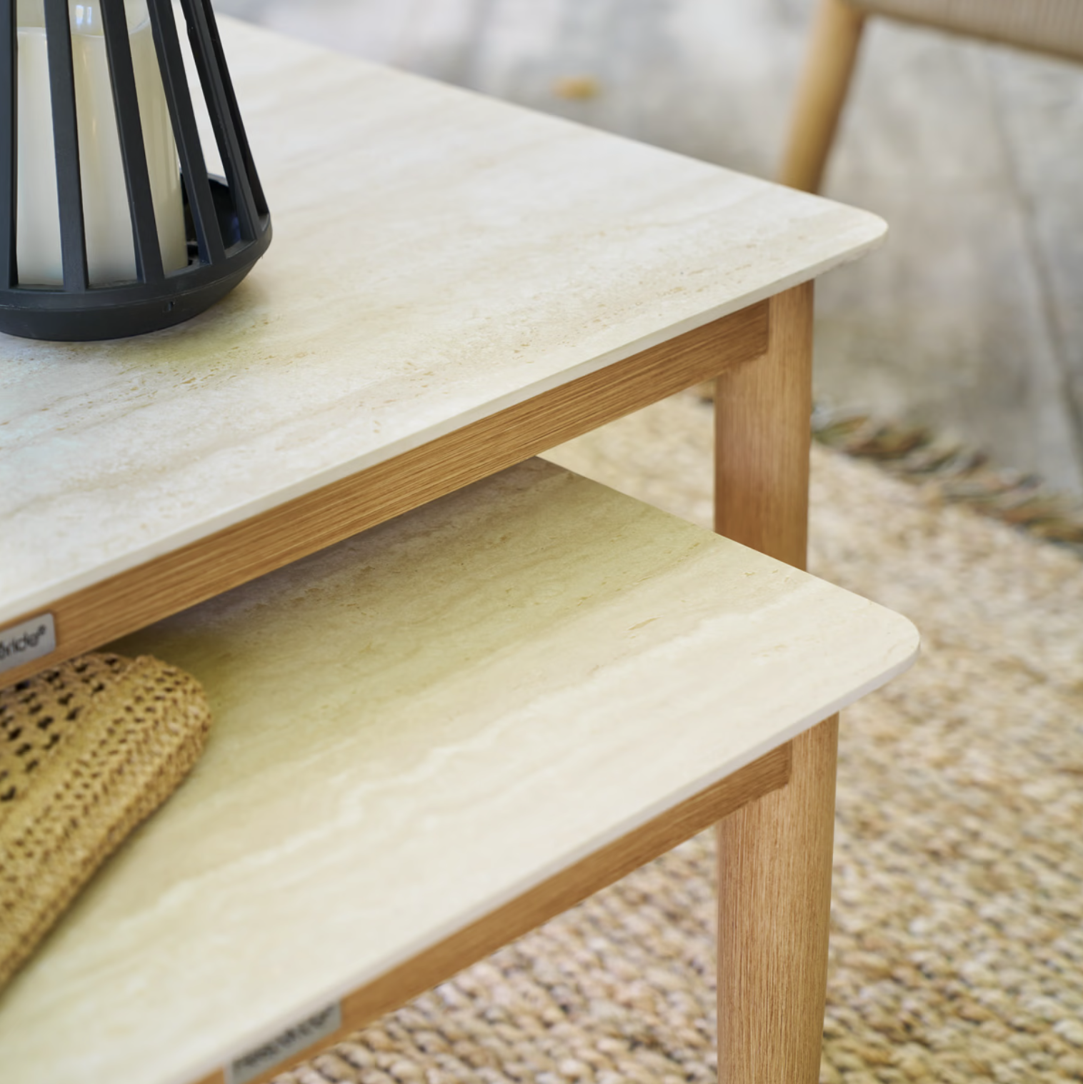 Design: Nowoczesny i estetyczny wygląd, z plecioną strukturą imitującą efekt szczotkowanego drewna, harmonizującą z nogami mebli oraz ławami.