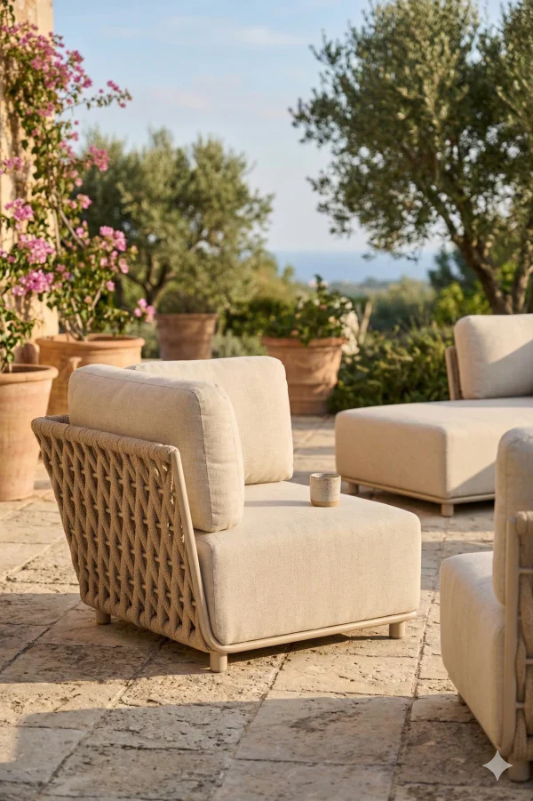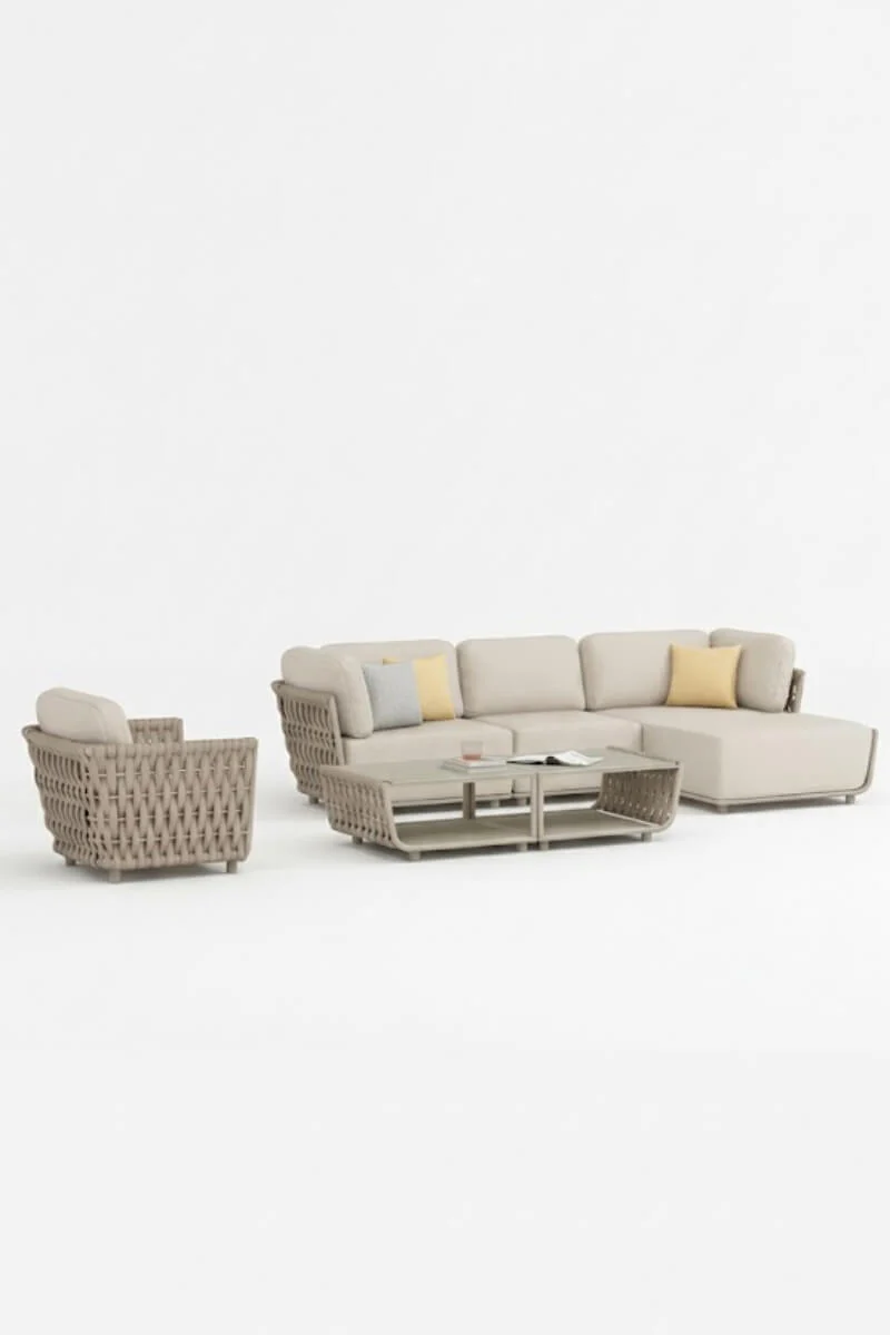 6 Elementów w jednym stylu: W skład zestawu wchodzą moduły, które możesz zestawiać w klasyczny narożnik, dwa mniejsze szezlongi lub otwarty układ lounge z oddzielnymi splotami.