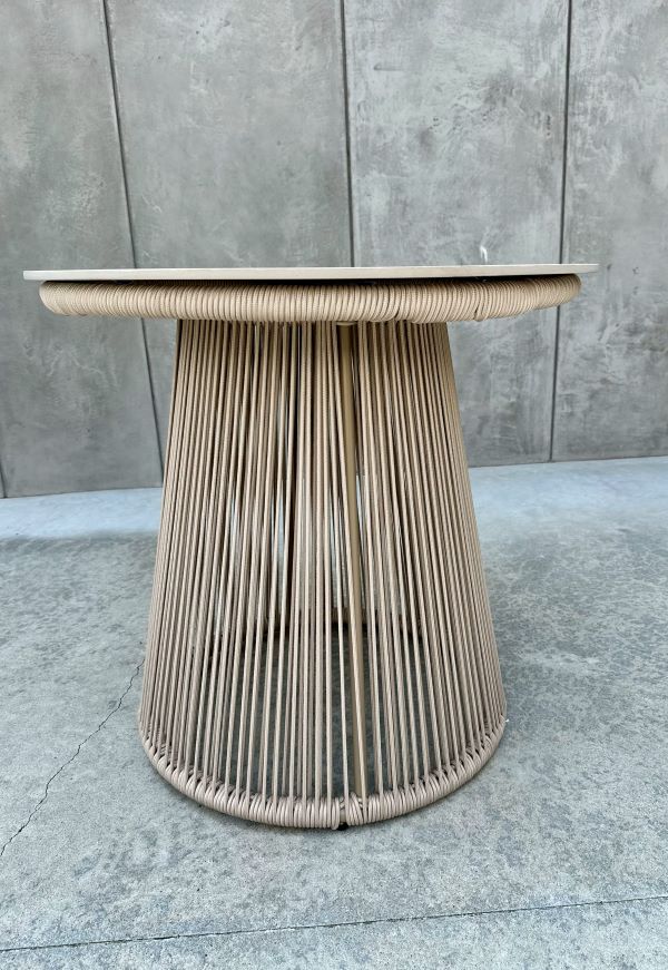 Wysoki stolik z ceramicznym blatem: Okrągły stolik o wysokości 73 cm posiada blat imitujący strukturę kamienia. Jest on niezwykle trwały, łatwy w czyszczeniu i odporny na zmienne warunki pogodowe.