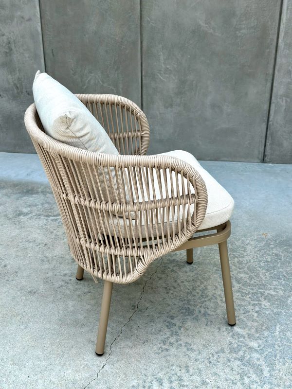 Zestaw AZZURA III to kwintesencja nowoczesnego designu, która pozwoli Ci stworzyć prywatną oazę relaksu na tarasie, balkonie czy w ogrodzie. Subtelny szampański odcień połączony z technicznym oplotem nadaje meblom lekkości, sprawiając, że idealnie wpisują się one zarówno w domowe zacisze, jak i eleganckie przestrzenie komercyjne.