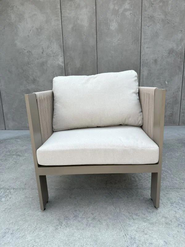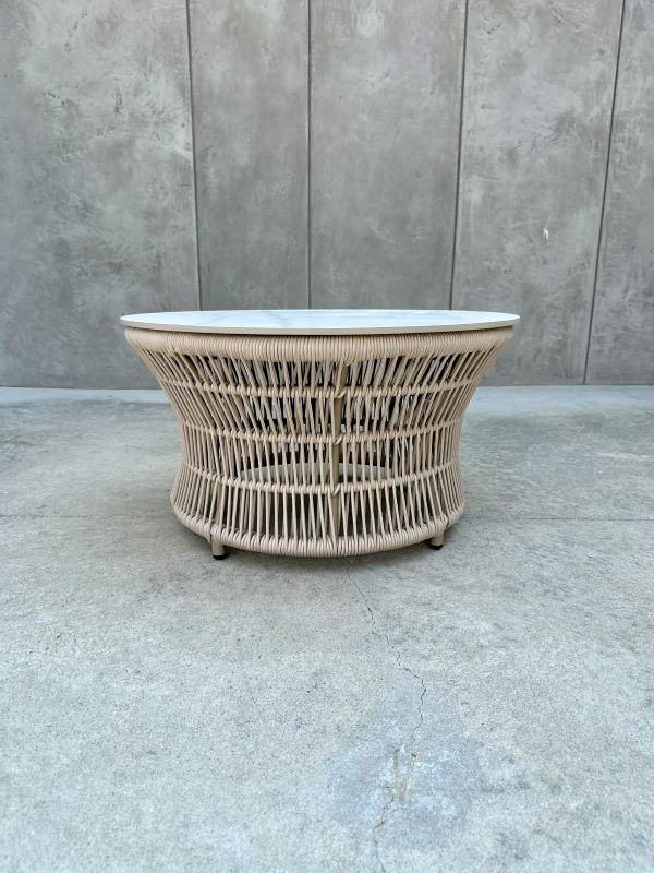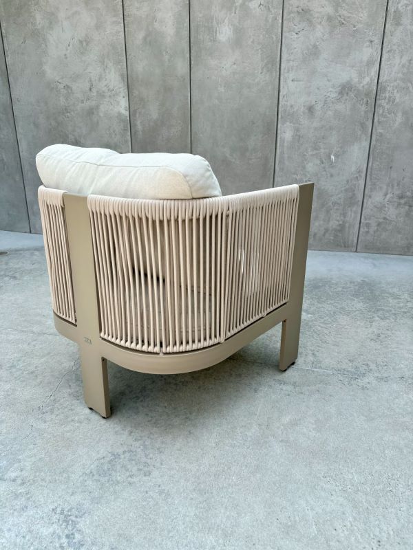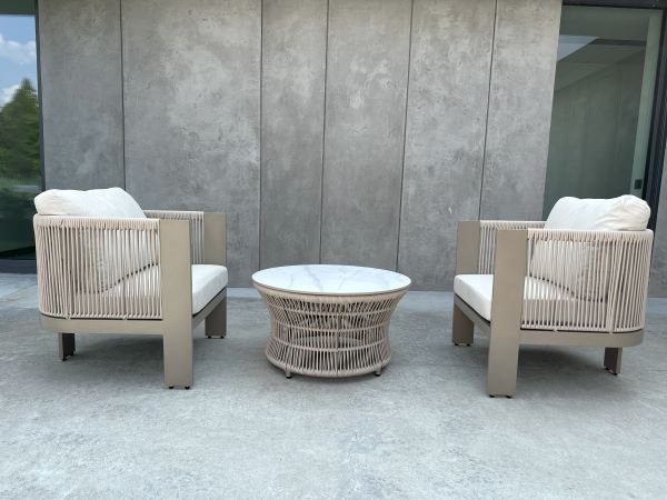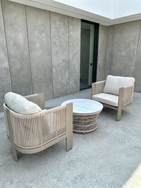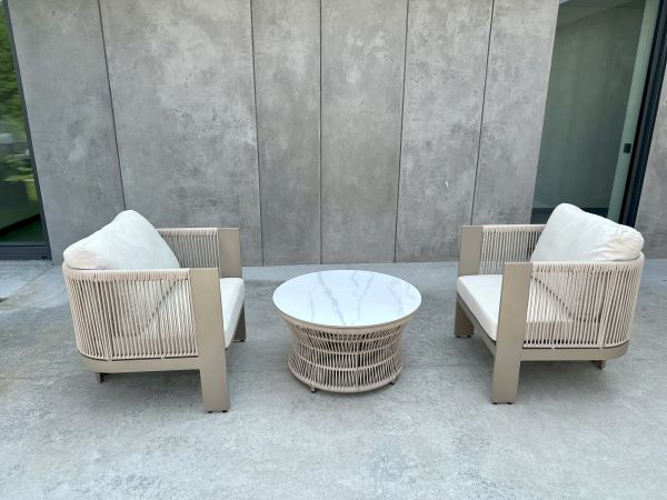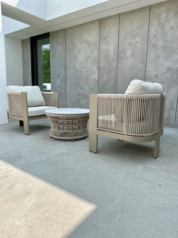 Oplot ze sznurka: Fotele oraz podstawa stolika zostały wykończone dekoracyjnym oplotem z wytrzymałego, wodoodpornego sznurka. Jest on odporny na odbarwienia, deformacje oraz zmienne warunki pogodowe.