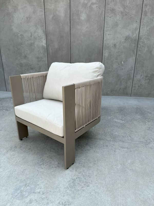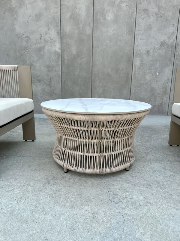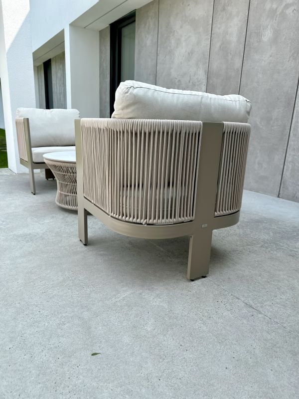 Zestaw wypoczynkowy LEONE III to kwintesencja nowoczesnego designu, która zamieni Twój taras lub ogród w luksusową strefę lounge. Subtelna, szampańska kolorystyka w połączeniu z marmurowym wykończeniem blatu tworzy kompozycję pełną elegancji, lekkości i nowoczesnego sznytu.