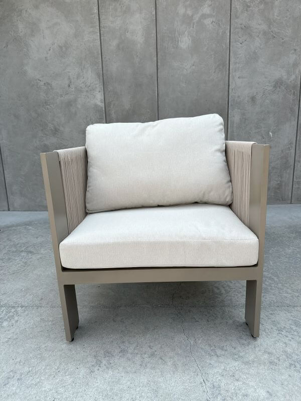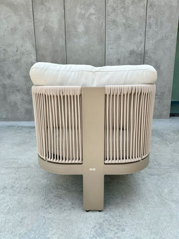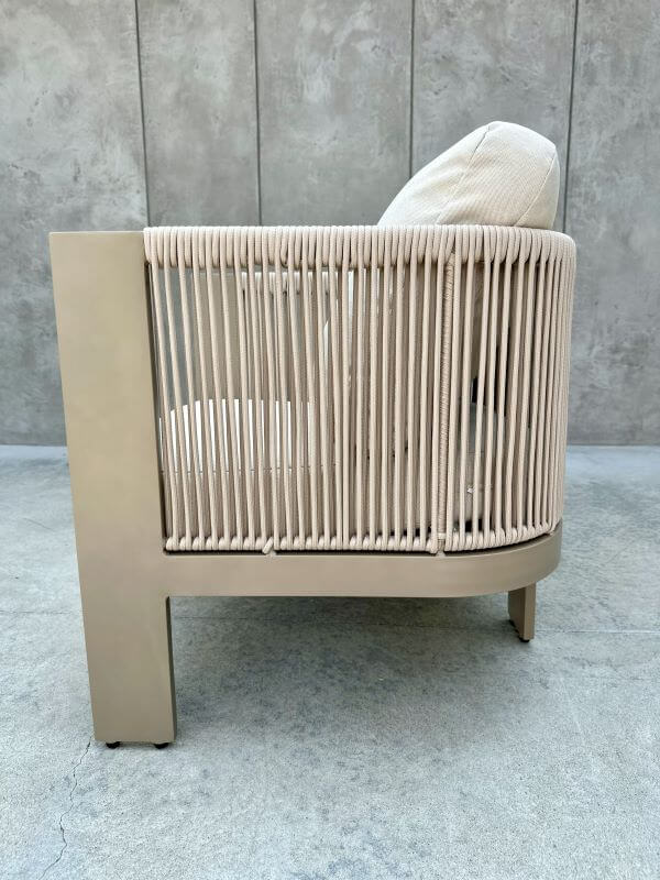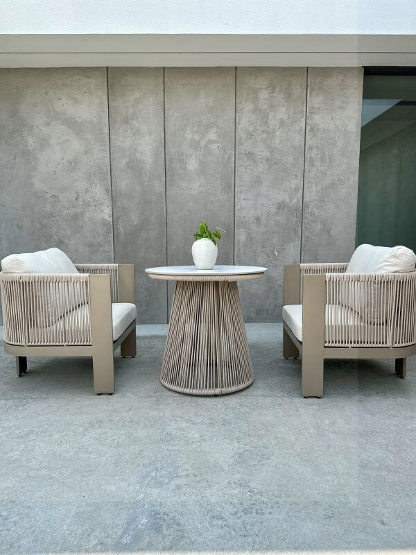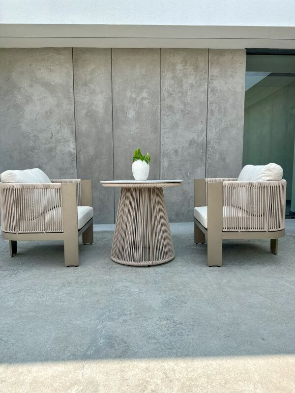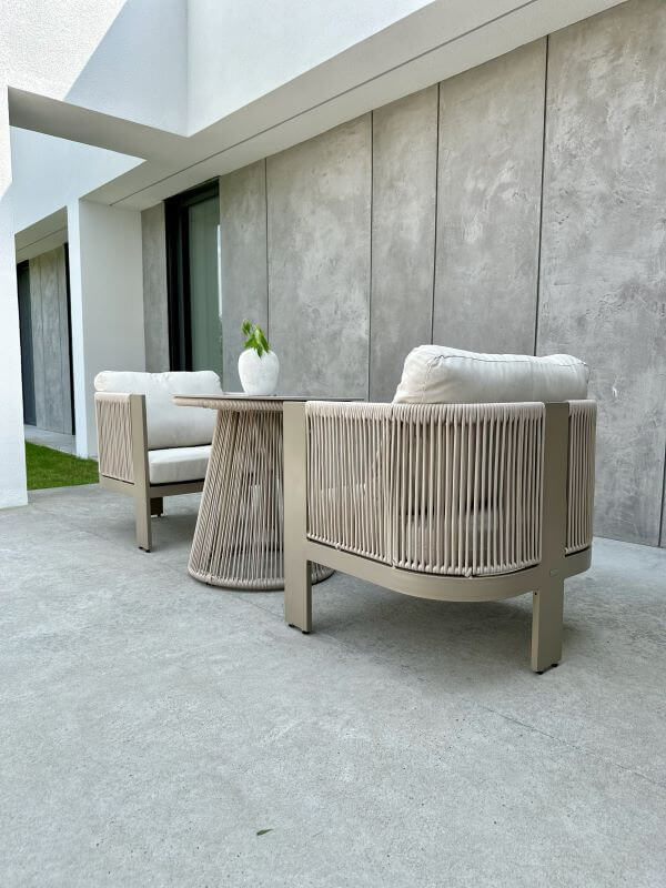 Oplot sznurkowy: Fotele oraz podstawa stolika ozdobione są wodoodpornym sznurkiem technicznym. Materiał ten nie rozciąga się i nie odbarwia, zachowując nienaganny wygląd przez lata, niezależnie od kaprysów pogody.