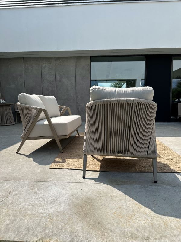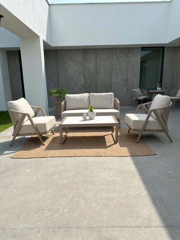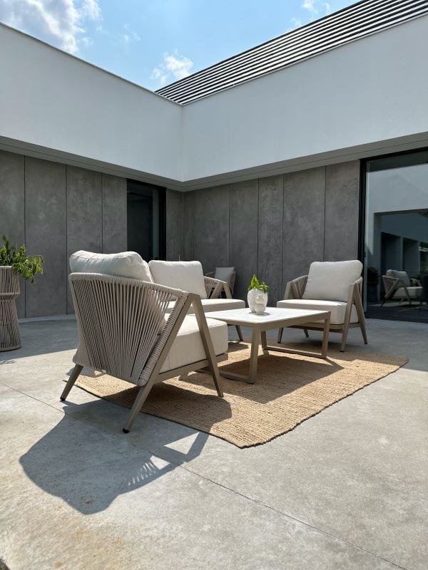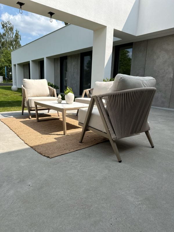 Zestaw Maksymo w stonowanym grafitowym wykończeniu to połączenie minimalistycznego designu oraz funkcjonalności gwarantującej wygodę i trwałość. Konstrukcja z malowanego proszkowo aluminium zapewnia lekkość oraz odporność na warunki atmosferyczne, a modułowy system pozwala zestawić sofy i fotele w dowolnej konfiguracji — w linii, narożniku lub ustawione luźno wokół stolika. Dzięki temu zestaw dopasujesz do przestrzeni tarasu, balkonu lub ogrodu — z wyjątkową łatwością i stylem.