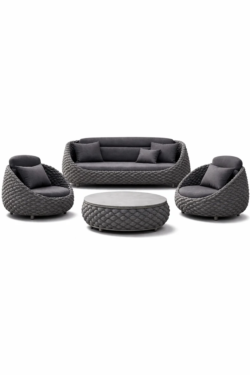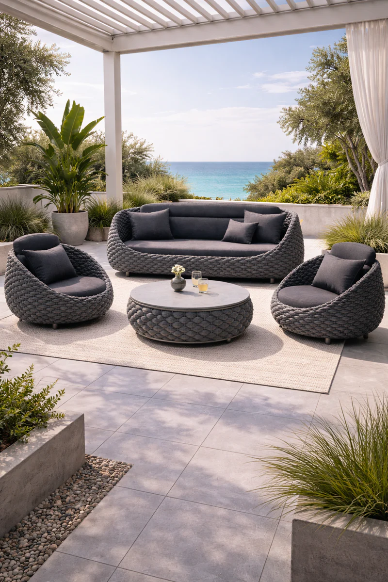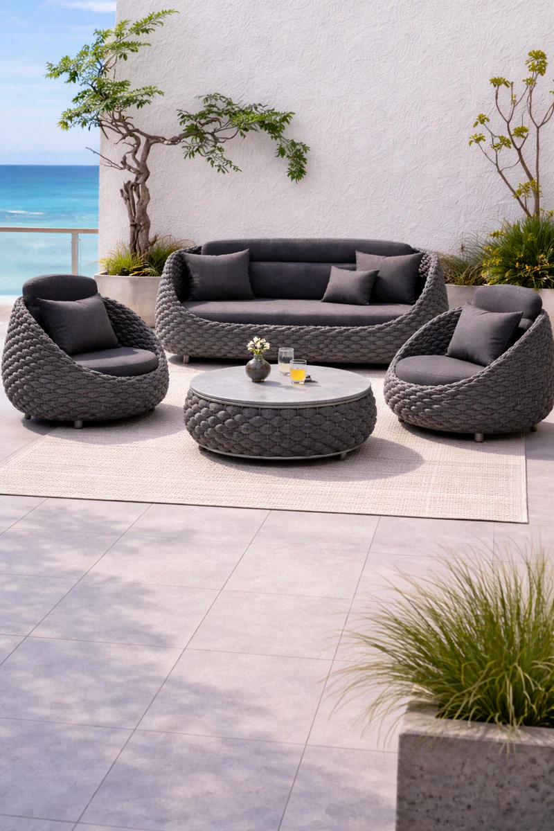Wyobraź sobie swój taras zamieniony w ekskluzywny salon pod chmurką. Zestaw ogrodowy Marino Lounge w odcieniu głębokiego grafitu to kompletna odpowiedź na potrzeby wielbicieli designu klasy premium. Łącząc surowość formy z miękkością wykończenia, ten czteroelmetowy zestaw tworzy spójną, luksusową przestrzeń, która przetrwa lata intensywnego użytkowania na zewnątrz.