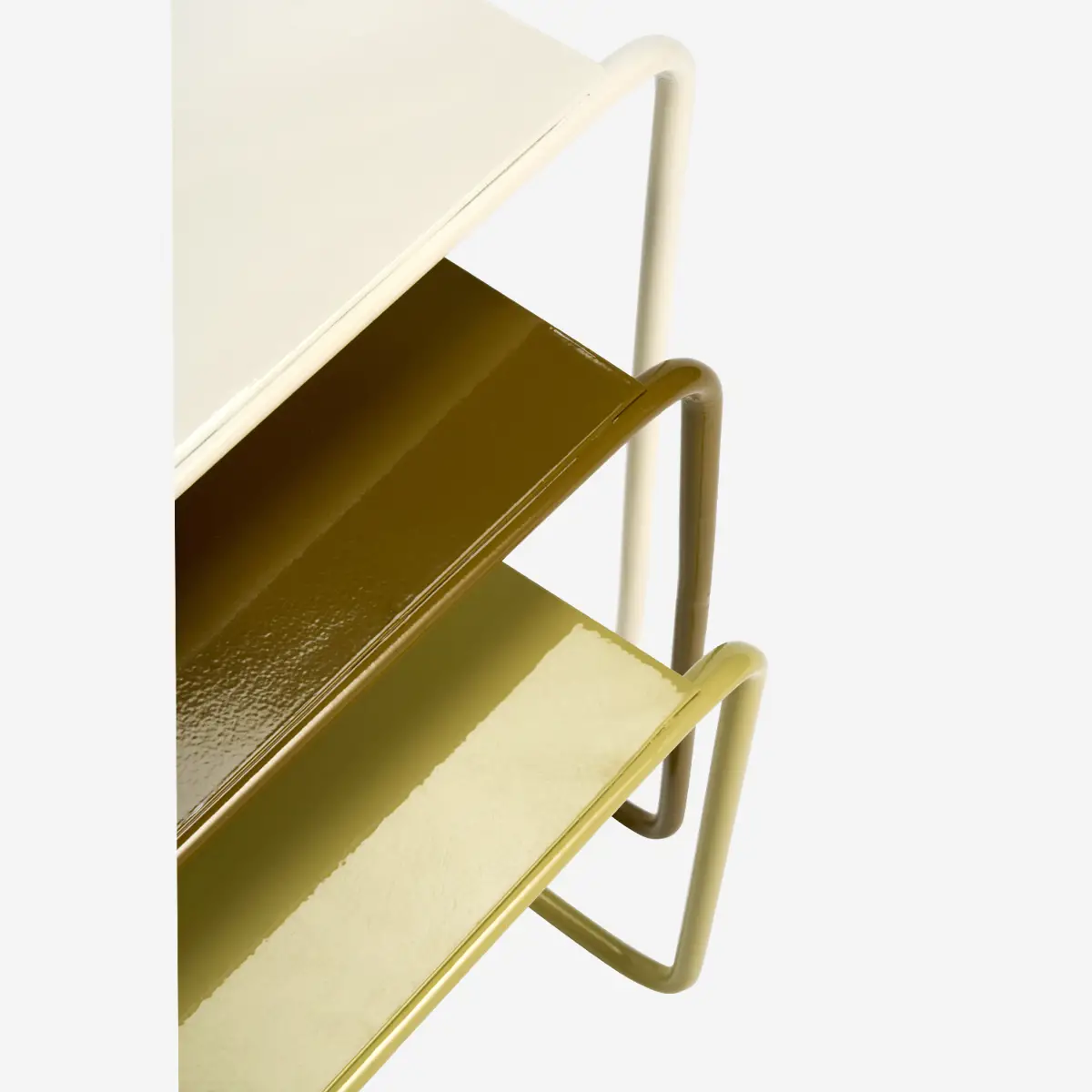 Konstrukcja stolików wykonana jest z wytrzymałego żelaza malowanego proszkowo, co gwarantuje gładkie i trwałe wykończenie. Harmonijne trio kolorystyczne - kremowy, oliwkowy oraz cytrynowy - nadaje całości nowoczesny, a jednocześnie spokojny charakter. Smukłe ramy i minimalistyczne blaty sprawiają, że stoliki są lekkie wizualnie, a jednocześnie stabilne, stanowiąc doskonałą bazę pod poranną kawę, ulubione lektury czy dekoracyjne świece.