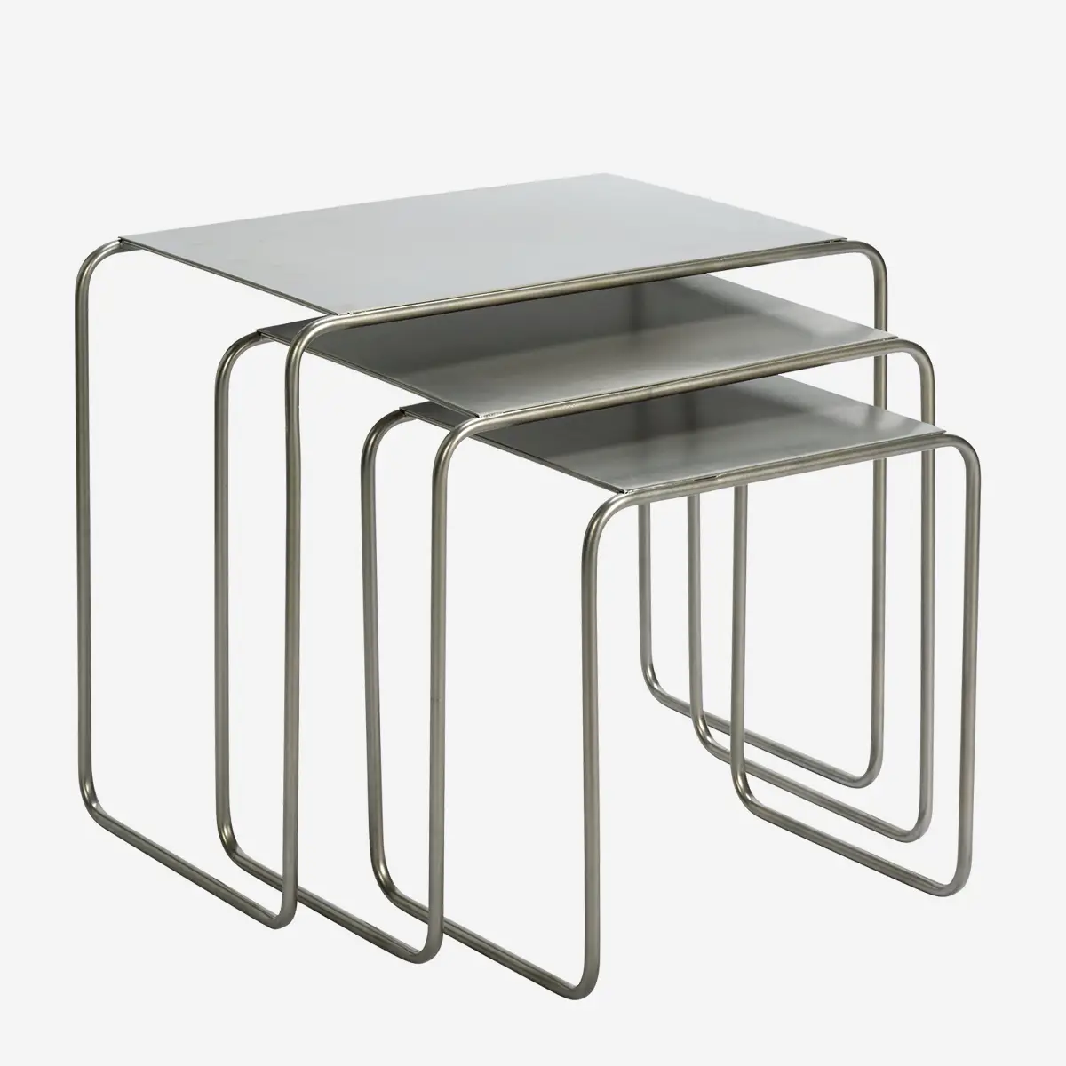 Stoliki charakteryzują się solidną konstrukcją z żelaza malowanego proszkowo. Wykończenie w kolorze stalowym o subtelnej teksturze nadaje im surowego, a jednocześnie eleganckiego wyrazu, który doskonale komponuje się z drewnem, betonem czy miękkimi tekstyliami. Smukłe profile i starannie wykonane spawy zapewniają trwałość przy zachowaniu wizualnej lekkości. To wszechstronny zestaw, który z powodzeniem zastąpi stolik kawowy, szafki nocne lub posłuży jako stylowa ekspozycja dla roślin i książek.