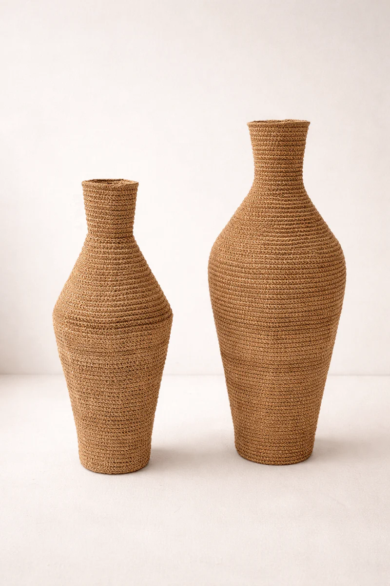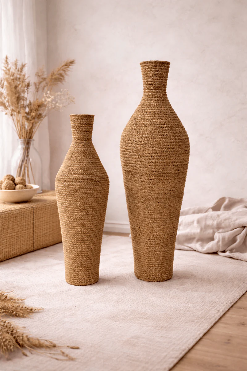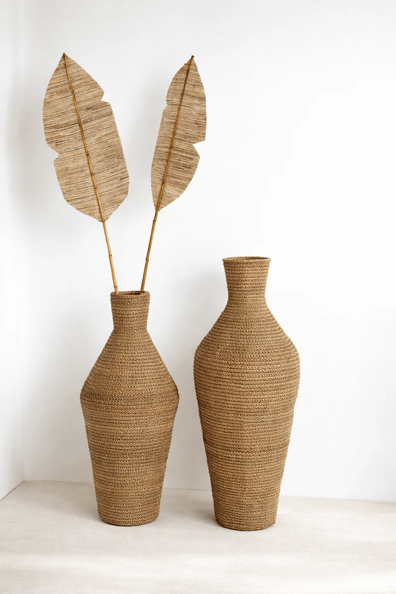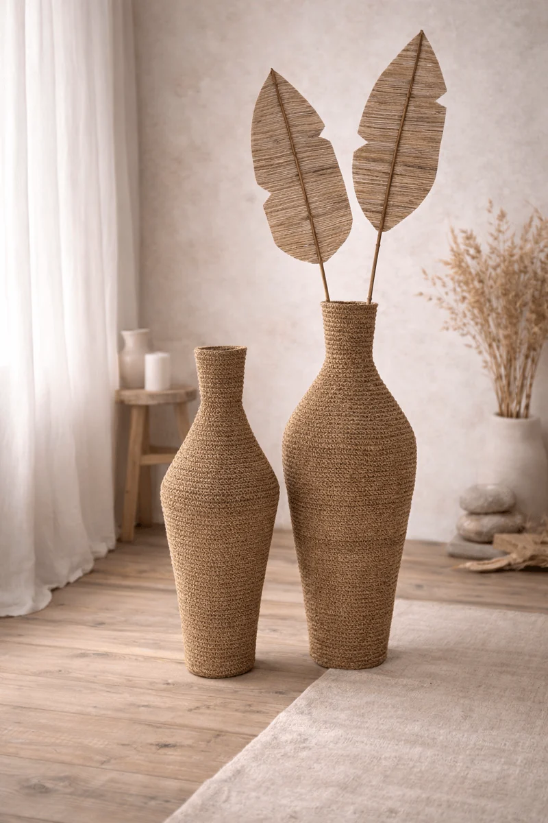 Naturalna tekstura: Wyraźny, ręczny splot trawy morskiej nadaje wazonom unikatowy charakter. Naturalne przejścia tonalne beżu i brązu sprawiają, że każdy egzemplarz jest jedyny w swoim rodzaju.